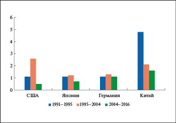 Рис. 1. Среднегодовые темпы прироста общей факторной производительности, % Источник: расчёт ИМЭМО РАН по данным International Productivity Monitor. http://www.csls.ca/ipm/ipm38.asp#:~:text=Martin%20Neil%20Baily%2C%20Barry%20P.%20Bosworth%20and%20Siddhi%20Doshi%0ALessons%20from%20Productivity%20Comparisons%20of%20Germany%2C%20Japan%2C%20and%20the%20United%20States%C2%A0 (accessed 1.12.2023); World Bank Group, and the Development Research Center of the State Council, P.R. China. 2019. Innovative China: New Drivers of Growth. Washington, DC: World Bank. DOI: 10.1596/978-1-4648-1335-1. License: Creative Commons Attribution CC BY 3.0. https://documents1.worldbank.org/curated/en/833871568732137448/pdf/Innovative-China-New-Drivers-of-Growth.pdf (accessed 1.12.2023)