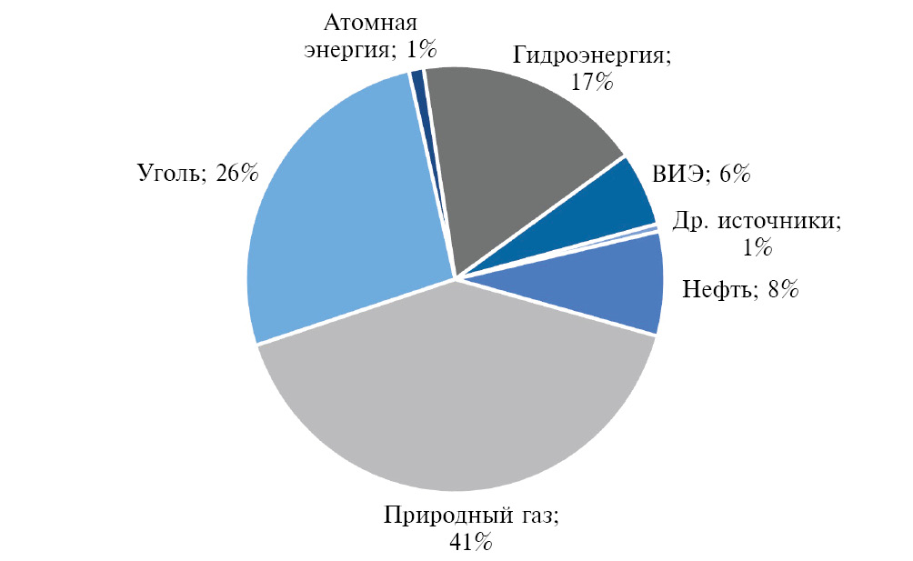 Рис. 2. Структура выработки электроэнергии в Африке (по источникам) в 2022 г., % Источник: составлено и рассчитано по Energy Statistics Data Browser. International Energy Agency (IEA). https://www.iea.org/data-and-statistics