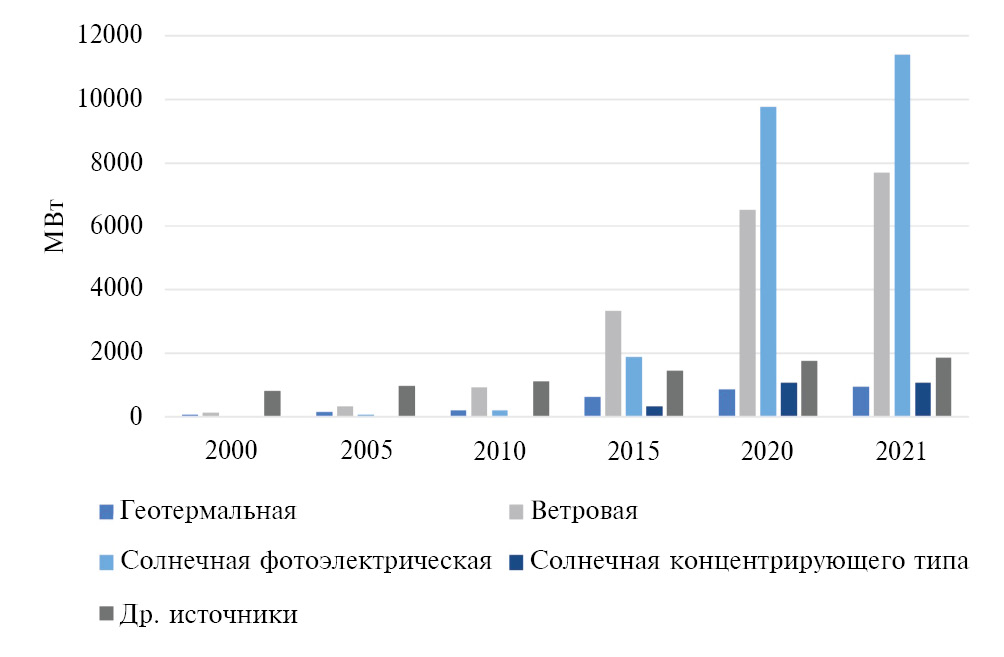 Основные изменения касаются места и роли возобновляемых источников энергии (помимо гидроэнергии) в энергетическом балансе Африки. В последние 20 лет именно на энергию солнца, ветра и другие альтернативные источники приходится наибольший прирост установленных мощностей и суммарной выработки электроэнергии. Так, установленные мощности ВИЭ (помимо гидроэнергии) в Африке возросли в 8.3 раза (с 3 ГВт в 2000 г. до 25 ГВт в 2022 г.) [12], а выработка ими электроэнергии – в 60 раз (с 777 млн кВт·ч в 2000 г. до 47 212 млн кВт·ч в 2021 г.) [6]. Наибольшими темпами оба показателя росли в области солнечной энергетики, при этом активно строятся солнечные электростанции как фотоэлектрического, так и концентрирующего типов (рис. 3 и 4).