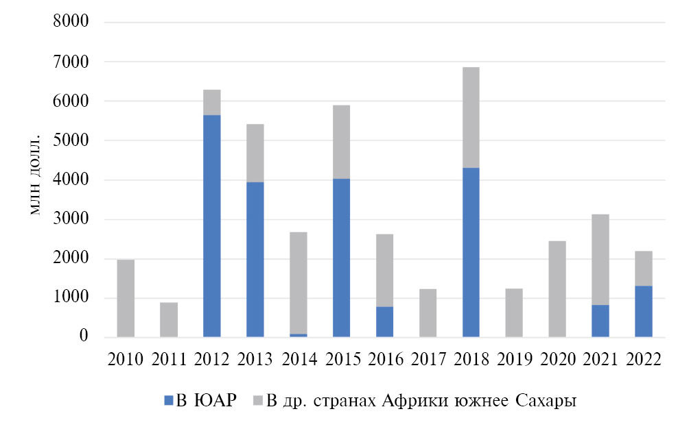 В число крупнейших получателей китайских капиталовложений входят Ангола (43% суммарных инвестиций в электроэнергетику за 2000–2022 гг.), ЮАР, Эфиопия, Судан и Замбия. Конкурентные преимущества китайских энергетических компаний состоят в наличии необходимых компетенций и опыта работы в Африке, возможности реализации проекта “под ключ” и в сжатые сроки, привлечении льготного китайского финансирования без обязательных требований политического и макроэкономического характера, готовности участвовать в проектах с высокими рисками, а также в странах с нестабильной внутриполитической ситуацией, в государствах, находящихся под международными санкциями, признанных западными странами неэффективными, коррумпированными, несостоявшимися. Динамика китайских инвестиций в Африку, в том числе в электроэнергетику, представлена на рисунке 6.
