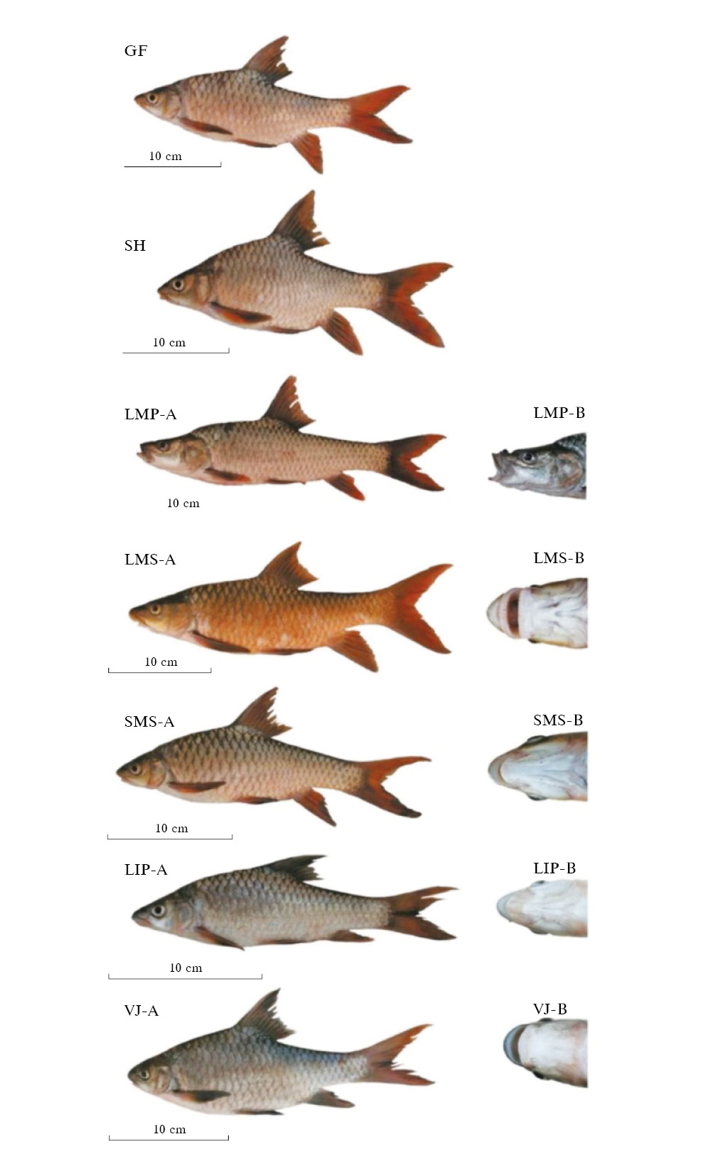 Рис. 2. Типичные представители форм крупных африканских усачей Barbus (=Labeobarbus) gananensis и B. jubae из р. Генале GF – генерализованная форма, типичный Barbus (=Labeobarbus) gananensis; SH – высокотелая форма; LMP – большеротая рыбоядная форма; LMS – большеротый соскрёбыватель; SMS – малоротый соскрёбыватель, вероятный гибрид B. gananensis × B. jubae; LIP – губастая форма с гипертрофированными губами; VJ – B. jubae, варикариноид; А – рыба целиком; B – голова
