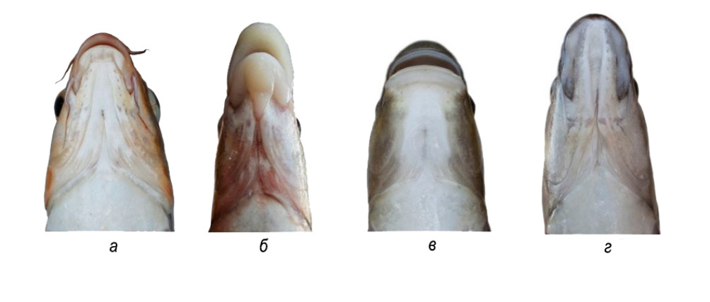 Рис. 3. Основные ротовые фенотипы в трофической диверсификации Barbus (=Labeobarbus) а – генералист; б – губастый; в – скребущий; г – рыбоядный