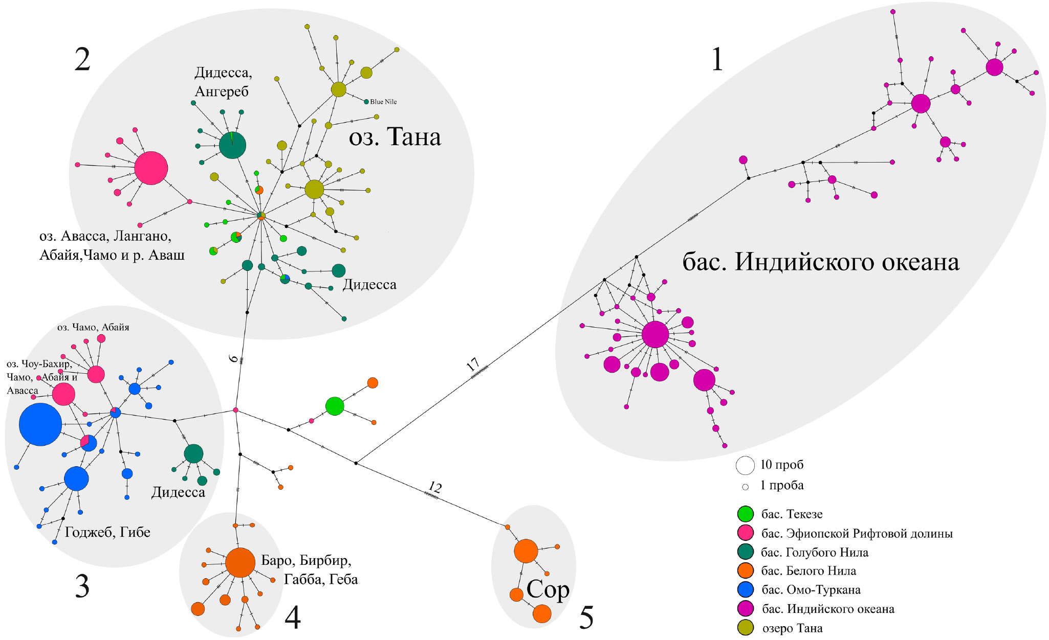 Рис. 4. Медианная сеть гаплотипов Barbus (=Labeobarbus) из основных бассейнов Абиссинского нагорья, восстановленная по 769 последовательностям цитохрома b (мтДНК) Гаплогруппа 1 соответствует комплексу L. gananensis/ L. jubae; гаплогруппы 2–5 объединяют полиморфную группу L. intermedius s. lato; чёрные круги – гипотетические гаплотипы. Сеть построена в программе PopART 1.7 (составлено по [23] c изменениями)