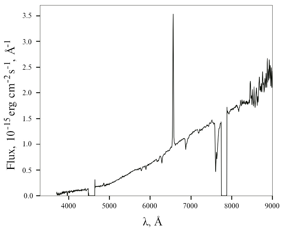 Рис. 4. Оптический спектр источника SRGA J124404.1-632232, полученный с помощью телескопа SALT Южноафриканской астрономической обсерватории [11]