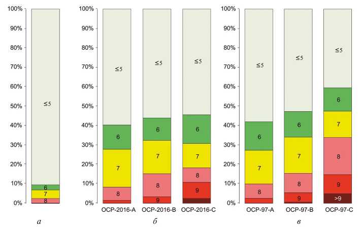 Рис. 1. Сопоставление площадей разной балльности на картах ОСР-97 и ОСР-2016 и реальных землетрясений а – доли суммарной площади теоретических изосейст 6, 7, 8 и 9 баллов от землетрясений в 1997–2022 гг., умноженные на 20; б – доли площадей зон разной балльности (6 и более) на картах ОСР-2016; в – на картах ОСР-97; площадь территории России принята за 100%; карты с пометкой “А” отвечает вероятности 0.1 превышения соответствующей интенсивности за 50 лет, карты “В” – 0.05, карты “С” – 0.01