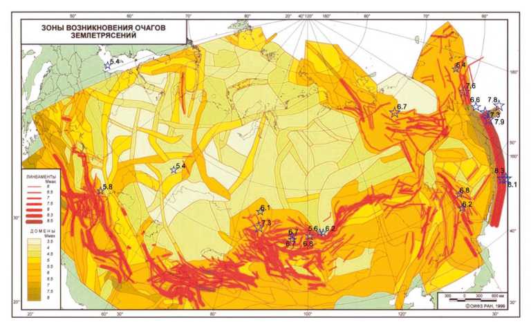 Рис. 2. ЛДФ-модель, на основе которой построены карты ОСР-97, и эпицентры сильных землетрясений с 1997 г. Сейсмолинеаменты показаны красными линиями, толщина которых соответствует максимальной магнитуде; максимальные магнитуды для доменов обозначены цветом; звёздочки – эпицентры, цифры рядом – магнитуда