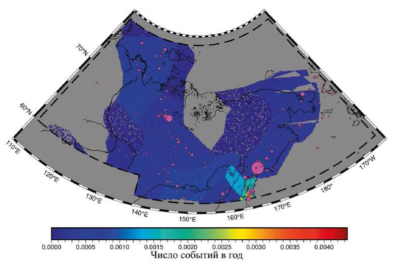 Рис. 5. Пространственное распределение фактических и модельных землетрясений (M≥4.6) в восточном секторе российской Арктики Кружки – эпицентры фактических землетрясений за 1982–2020 гг.; цветом показана плотность модельных землетрясений в год; соответствие цветов плотности совпадает с рисунком 4; использована модель среднего положения [26], построенная по событиям с M≥4.0 за 1982–2020 гг.