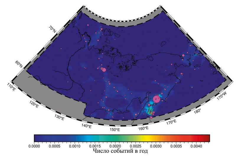 Рис. 4. Пространственное распределение фактических и модельных землетрясений восточного сектора российской Арктики с M≥4.6 Кружки – эпицентры фактических землетрясений за 1982–2020 гг., их размеры возрастают с увеличением магнитуды; цветом показана плотность числа модельных землетрясений в год; использовалась ЛДФ-модель, лежащая в основе ОСР-2016 [23]