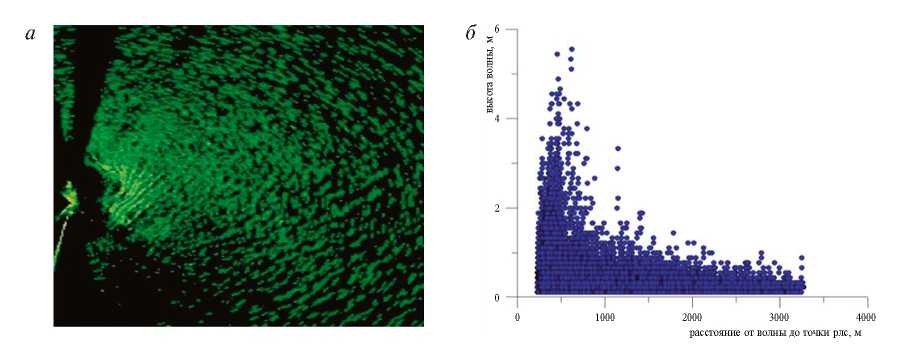 Рис. 5. Фиксация волнения в Охотском море во время трёхбалльного шторма (а), зависимость высоты волны от расстояния до точки постановки РЛС (б)