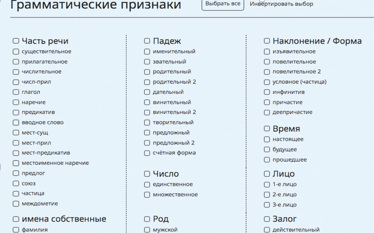 Правила (и разметка) должны быть технологичны – для удобства поисковика, но одновременно просты и наглядны, чтобы быть доступны для пользователя, в том числе не обладающего профессиональной подготовкой теоретического лингвиста. На рисунке 1 представлен фрагмент расширенной грамматической таблицы с чек-боксами для выбора нужных значений (и цепочек таких значений), в которой достаточно легко ориентироваться, задавая поисковые параметры. Внутри основного подкорпуса можно выбирать параметры текста: автора, тематику, жанр и проч.; для этого разработчики предварительно проводят разметку текстов по этим параметрам (метаразметка). Таким образом, можно выявлять особенности употребления лексики, например её частотность, в разных жанрах и типах текстов, а также у разных авторов.