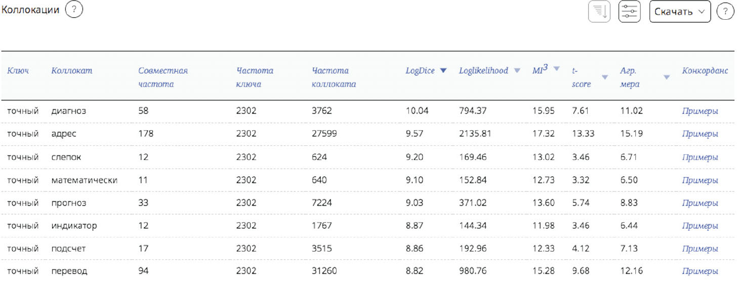 Рис. 2. Статистика коллокаций с прилагательным точный