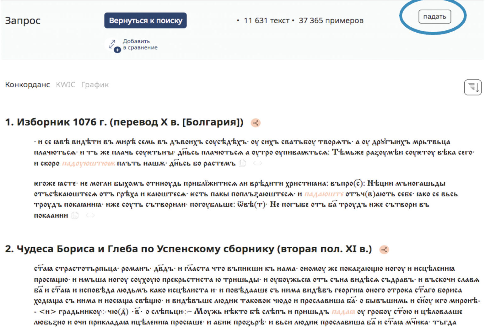 С возникновением панхронического корпуса произошла в подлинном смысле революция: теперь можно проследить (причём начиная с самых первых письменных памятников) развитие любого слова, конструкции, приставки, грамматической формы и т.д. вопреки тому, что изменились орфография, грамматика и язык в целом. Это может сделать любой пользователь, не обязательно профессиональный историк языка (правда, потом всё равно придётся разбирать полученные примеры из летописей и грамот). Мы задаём поиск в современной орфографии, а получаем все примеры, включая древние. Иллюстрацией может быть рисунок 3, где показана выдача по запросу к панхроническому корпусу на глагол падать. Показаны начальные примеры из 37 365 найденных.