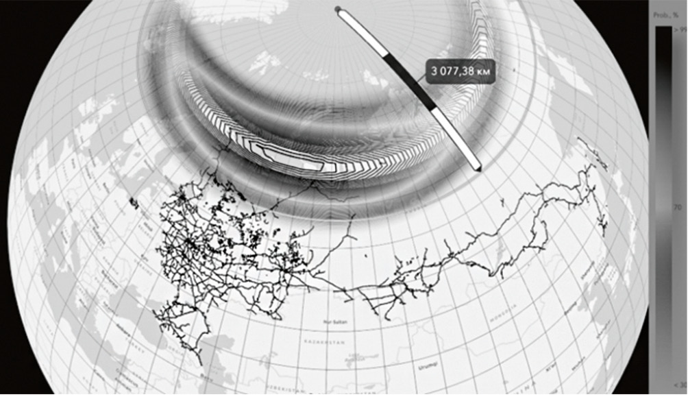 Рис. 4. Моделирование положения аврорального овала на виртуальном глобусе с нанесённой схемой железных дорог РФ