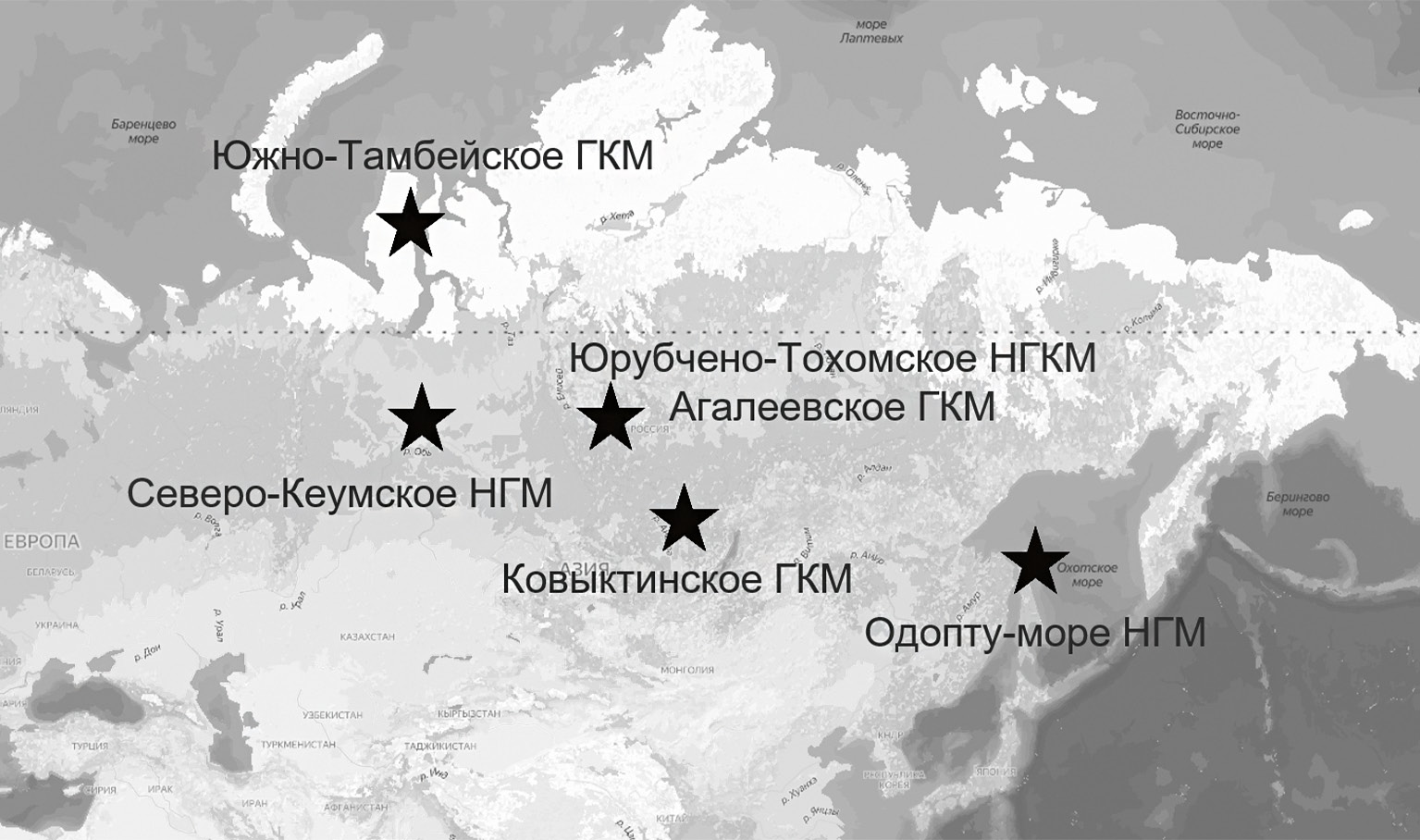 Примечание: звёздочками обозначены месторождения, где внедряется технология геомагнитного сопровождения (ГКМ – газоконденсатное месторождение, НГМ – нефтегазовое месторождение, НГКМ – нефтегазоконденсатное месторождение)