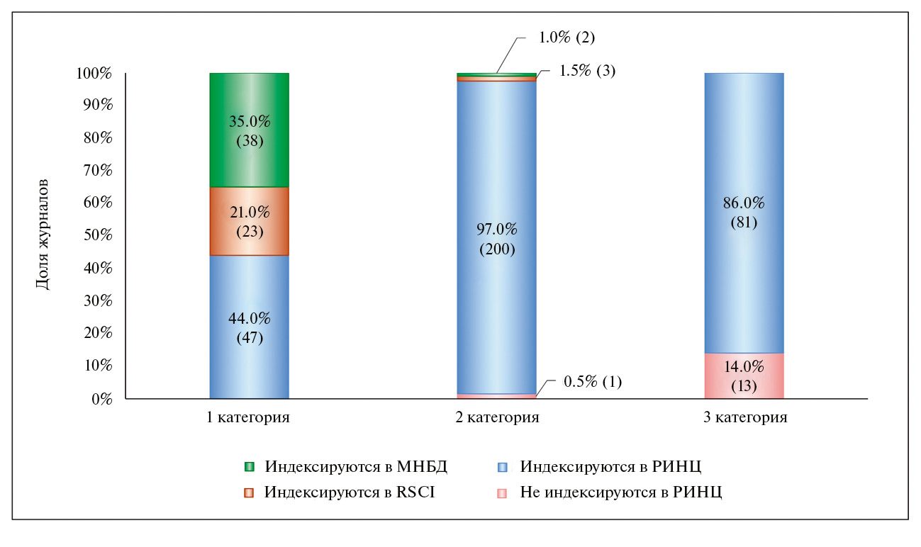 На рисунке 1 представлено распределение журналов в перечне ВАК по категориям: 108 изданий включены в первую категорию (К1), 206 изданий – во вторую (К2), 94 издания – в третью (К3). Большинство журналов, индексируемых в МНБД и в RSCI, как наиболее научно значимые отнесены к первой категории (61 журнал (К1) – 56%). Высокий научный уровень этих изданий подтверждён независимой экспертизой, в результате которой они вошли в МНБД “Web of Science” и/или “Scopus”, а также в RSCI. Основной массив журналов второй категории представлен журналами, индексируемыми только в РИНЦ. Доля высокорейтинговых журналов в этой категории минимальная: всего пять изданий, включённых в МНБД и RSCI, входят в К2. В третьей категории высокорейтинговые журналы отсутствуют.
