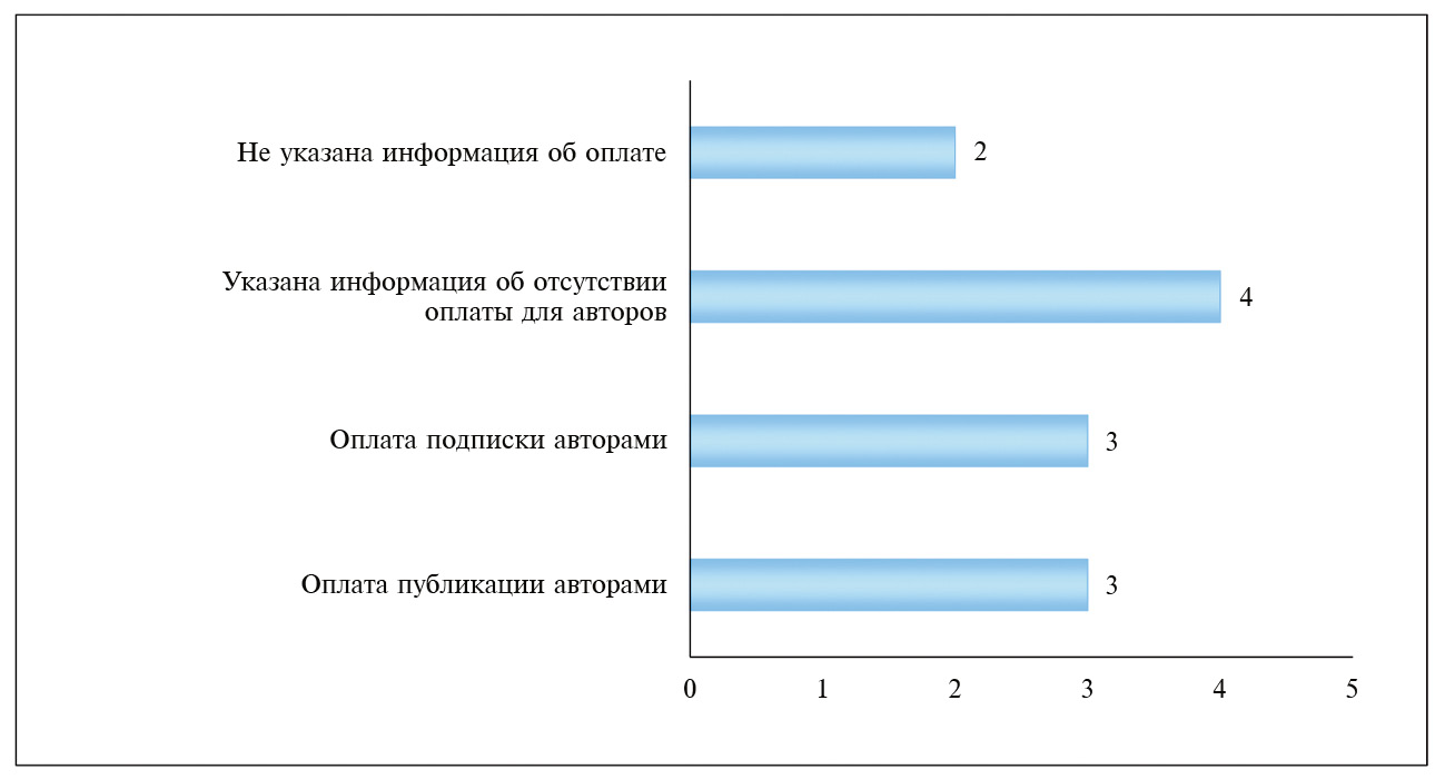 Изучение финансовых моделей (рис. 2), применяемых при издании журналов, не индексируемых в РИНЦ, показало, что условием публикации в них, как правило, является оплата автором услуг редакции либо обязательное оформление подписки. При этом стоимость подписки обычно завышена, то есть фактически это полный аналог оплаты публикации авторами. На сайтах четырёх журналов размещена информация об отсутствии оплаты. Однако признаки “хищнических” изданий (взрывной рост публикаций, этические проблемы), выявленные в трёх из них (учредитель – упомянутое ООО “Университет дополнительного профессионального образования”), дают основания полагать, что их финансовая модель так или иначе сопряжена с коммерческой деятельностью организации-учредителя. У ряда журналов финансовая модель непрозрачная: на сайте нет информации о наличии или отсутствии авторской платы за публикации.