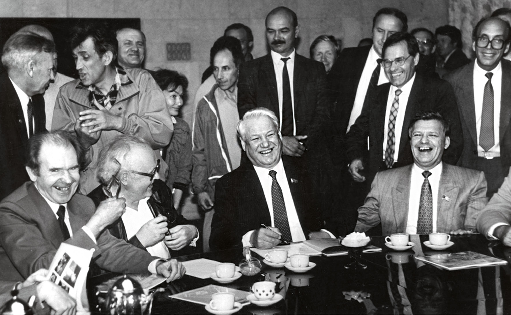 Визит Президента РФ Б.Н. Ельцина в ИЯФ. Сидят (слева направо): Э.П. Кругляков, В.А. Сидоров, Б.Н. Ельцин; стоят (слева направо): В.А. Коптюг, В.А. Ауслендер. 2 июля 1991 г. Фото: В. Крюкова