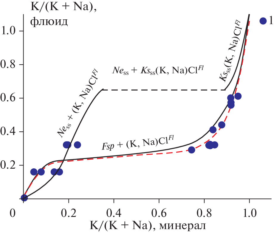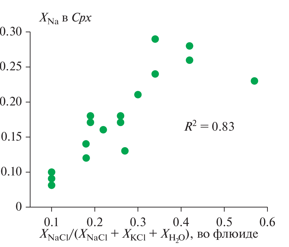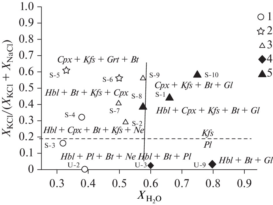 The article presents experimental data on the interaction of amphibole with NaCl-H2O and (K, Na)Cl-H2O solutions at varying salt content. When interacting with the H2O-NaCl fluid, amphibole remains the predominant mineral in all experiments. In addition to it, Na-phlogopite, plagioclase, and nepheline/sodalite are formed. At \({{a}_{{{{{\text{H}}}_{{\text{2}}}}{\text{O}}}}}\) > 0.6, amphibole melts. When amphibole interacts with the H2O-NaCl-KCl fluid at \({{X}_{{{{{\text{H}}}_{{\text{2}}}}{\text{O}}}}}\) < 0.40 and ХKCl/(ХKCl + ХNaCl) in the fluid, defined as ХNaCl = 0.506 – 0.84ХKCl, the amphibole is replaced by an association of nepheline with acid plagioclase, sodalite, and biotite. At ХKCl/(ХKCl + ХNaCl) > 0.3, nepheline, sodalite, and plagioclase become unstable, K-feldspar appears, and biotite, clinopyroxene, and amphibole remain. At ХKCl/(ХKCl + ХNaCl) > 0.5, the association Cpx + Bt + Kfs + Grt (grossular–andradite) is stable. Thus, the grossular–andradite garnet is an indicator of high potassium activity in fluids, while nepheline is an indicator of high sodium activity. Na → K isomorphism is observed in amphibole and biotite, and Ca → Na isomorphism in clinopyroxene, but in general these minerals (unlike nepheline and garnet) remain stable in the range of wide K/Na variations in the fluid. Clinopyroxene in experiments corresponds to Ca-Fe-Mg compositions with varying, sometimes high aluminium content, amphiboles belong to the pargasite-hastingsite composition. With an increase in \({{a}_{{{{{\text{H}}}_{{\text{2}}}}{\text{O}}}}}\) (\({{X}_{{{{{\text{H}}}_{{\text{2}}}}{\text{O}}}}}\) > 0.57), i.e. a decrease in the gross salinity of the fluid, melts appear, the composition of which varies from trachyte to phonolitic. As ХKCl/(ХKCl + ХNaCl) increases in fluids, the alumina content of melts decreases. An increase in the total salinity of the fluid leads to an increase in the content of potassium in the melt and a decrease in the content of chlorine in it. Experiments have shown that the interaction of amphibole with fluids containing high concentrations of NaCl and KCl leads to the formation of mineral associations typical of alkaline metasomatism of amphibole rocks and concomitant HCl enrichment of the fluid phase. The replacement of fluids with a high saline component by highly acid ones leads to the leaching of Ca, Mg, Fe from metamorphic rocks, their transport and redeposition. Thus, in some cases, a significant removal of FeO, MgO, CaO is a consequence of the interaction of host rocks with water-salt solutions.
