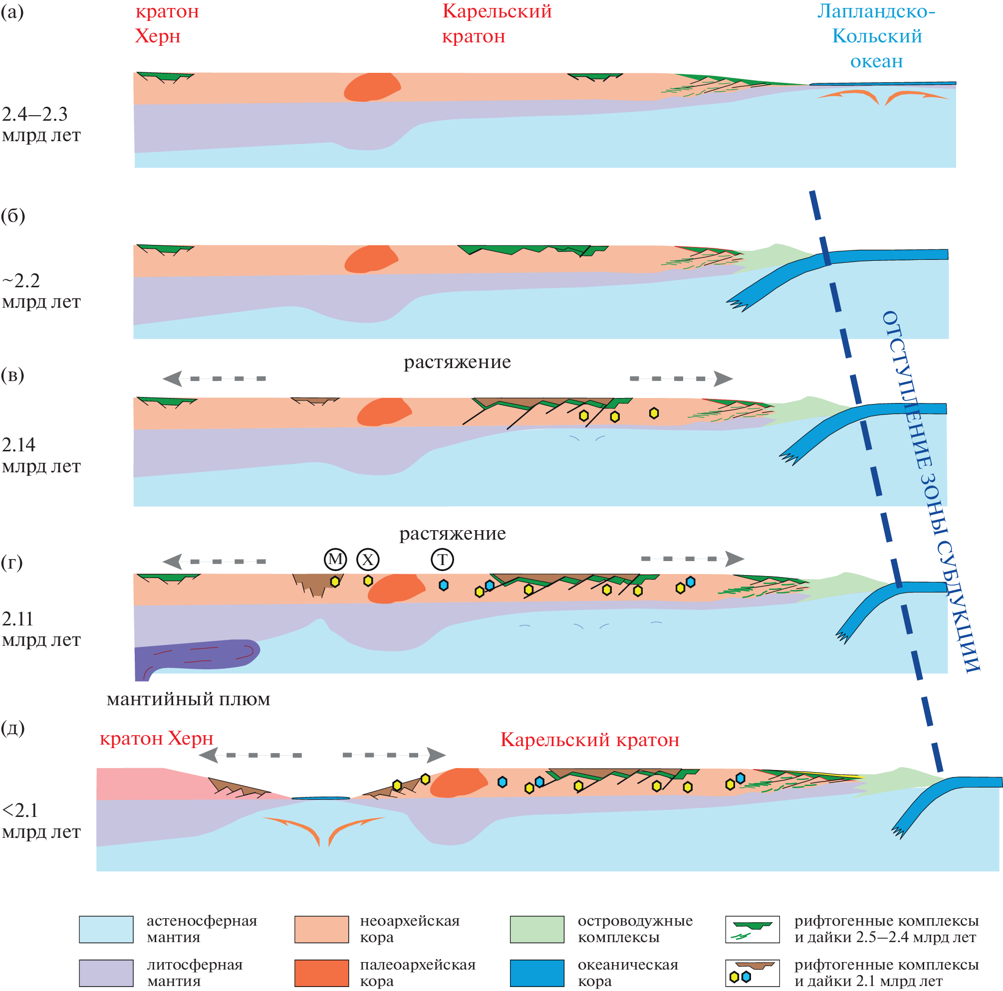 Mafic within-plate magmatism is the main source of information about the geodynamics of processes that lead to the breakup of continental blocks. The article discusses the problem of geodynamics of the split of the Archean supercraton Superia in the Middle Paleoproterozoic. The discussion is based on data on 2.1 Ga magmatism in the Karelian Craton, where basites of this age are represented by tholeiites of two geochemical types: depleted and enriched. Geochemically close to N-MORB, depleted tholeiites were studied in Northern Priladozhye where they form methadoleritic dike swarms at c. 2111 ± 6 Ma (U-Pb, SIMS, zircon) in the Khatunoiya locality, and pillow lavas and sills near Lake Maloye Janisjarvi. Enriched tholeiites were studied in the Lake Tulos locality where they form a large swarm of doleritic dikes at 2118 ± 5 Ma (U-Pb, ID-TIMS, baddeleyite). The results of these studies provide deeper insight into 2.1 Ga mafic magmatism. Depleted tholeiites with N-MORB geochemistry have a spatial distribution in the Karelian Craton and could be formed as a result of decompression melting of a depleted asthenospheric mantle, raising melts along the extension zones, and minimal contamination by the Archean crust. The simultaneous formation of enriched tholeiitic melts probably occurred at differentiation and crustal contamination of depleted tholeiites during melt migration through more rigid Archean crustal blocks. Data on basic magmatism with an age of 2.1 Ga in the Karelian craton, which are difficult to explain within the framework of the mantle plume rise model, are consistent with the model of lithosphere extension due to the retreat of the subduction zone in the northeastern framing of the craton, in the Lapland-Kola Ocean in the interval of 2.0–2.2 Ga years. The maximum thinning, discontinuity of the Archean continental lithosphere, and the opening of an oceanic basin at the western edge of the Karelian craton were probably controlled by the suture zone of the junction of the Neoarchean crust with the Paleoarchean blocks, a chain of which was traced in the west of the Karelian craton. An additional factor that led to breakup of the lithosphere 2.1 Ga ago could be the rise of a deep mantle plume in the Khern craton, which occupied a spatial position close to the Karelian craton in the Archean supercraton Superia.