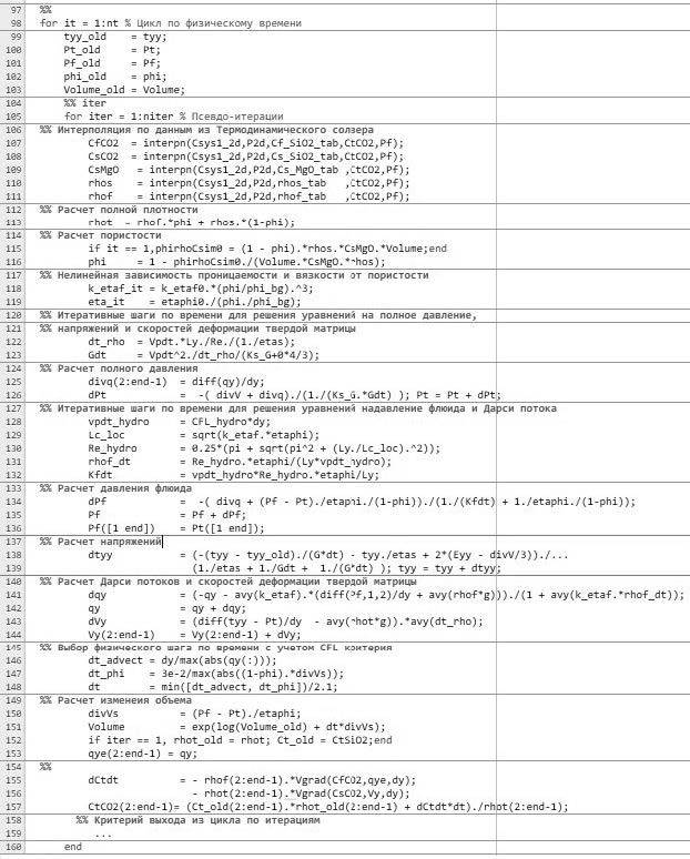 где Cf,CO₂, Cs,CO₂, Ct,CO₂ – массовая концентрация CO₂ во флюиде, в твердой фазе и во всей системе соответственно; Cs,MgO – массовая концентрация MgO в твердом скелете. Что касается гидро-механической части вышеописанных уравнений, то она остается неизменной.