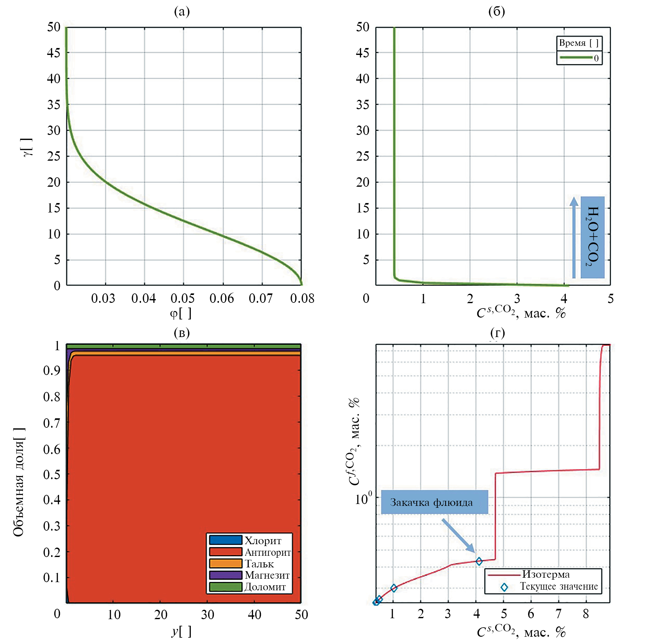 Для демонстрации мы остановились на рассмотрении случая образования талька и магнезита из серпентинита при 300°C и 0.3 ГПа (Beinlich et al., 2020). Для этого была проведена 1D-численная реализация предложенной гидро-хемо-механической модели в MATLAB. Изначально всю расчетную область занимает серпентинит, находящийся в равновесии с поровым H₂O-CO₂ флюидом. Минеральный состав представлен на рис. 2в. Начальная пористость в модели составляет 0.02 и имеет аномалию с повышенным значением на нижней границе расчетной области (зеленая линия на рис. 2а и 2б. Также на нижней границе расчетной области происходит закачка флюида с некоторой концентрацией CO₂ (рис. 2г), не находящегося в равновесии с исходной породой. Флюид вступает в реакцию с исходной породой с образованием новых минеральных комплексов, постепенно трансформирующих породу.