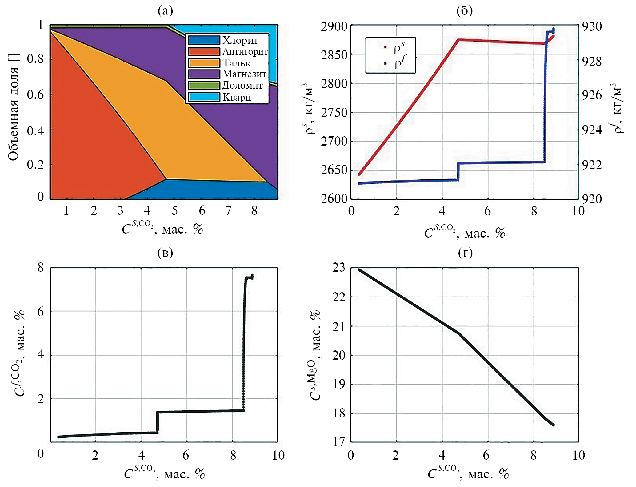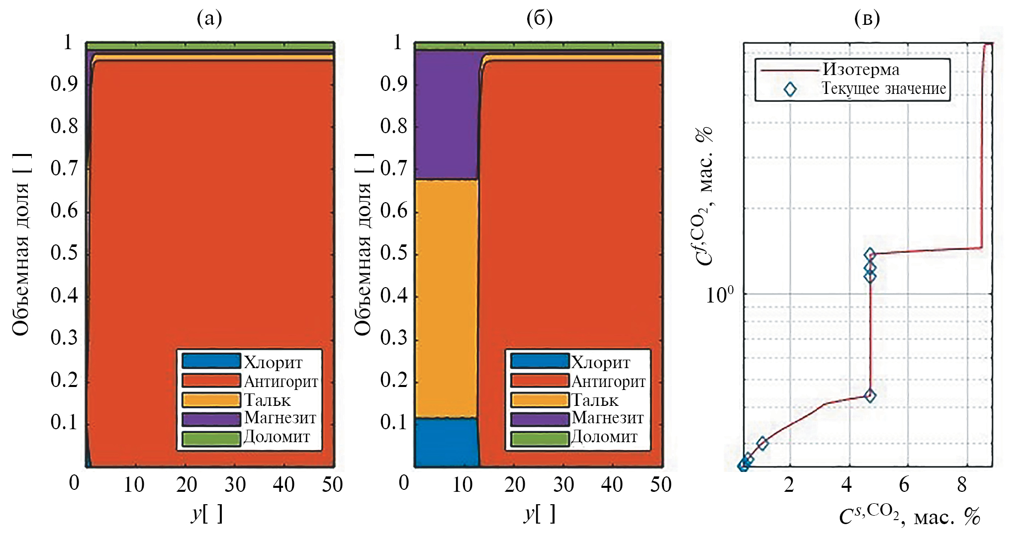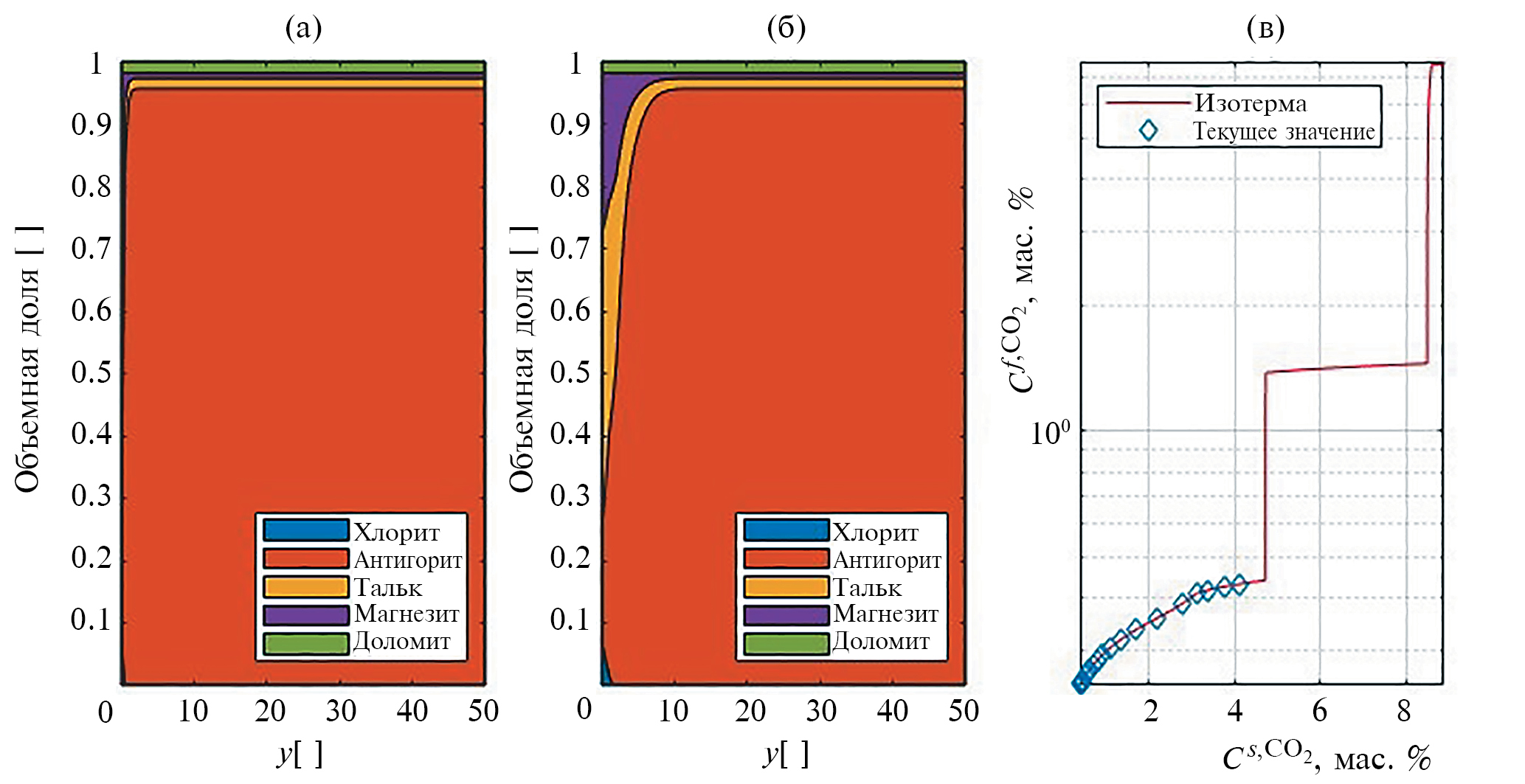 Происходит преобразование серпентинита, сопровождающееся исчезновением антигорита и образованием талька и магнезита по мере продвижения фронта (рис. 7). Данный реакционный фронт обусловлен резким скачком на графике, показывающем равновесное соотношение между концентрацией CO₂ во флюиде и в твердой матрице (рис. 7в).