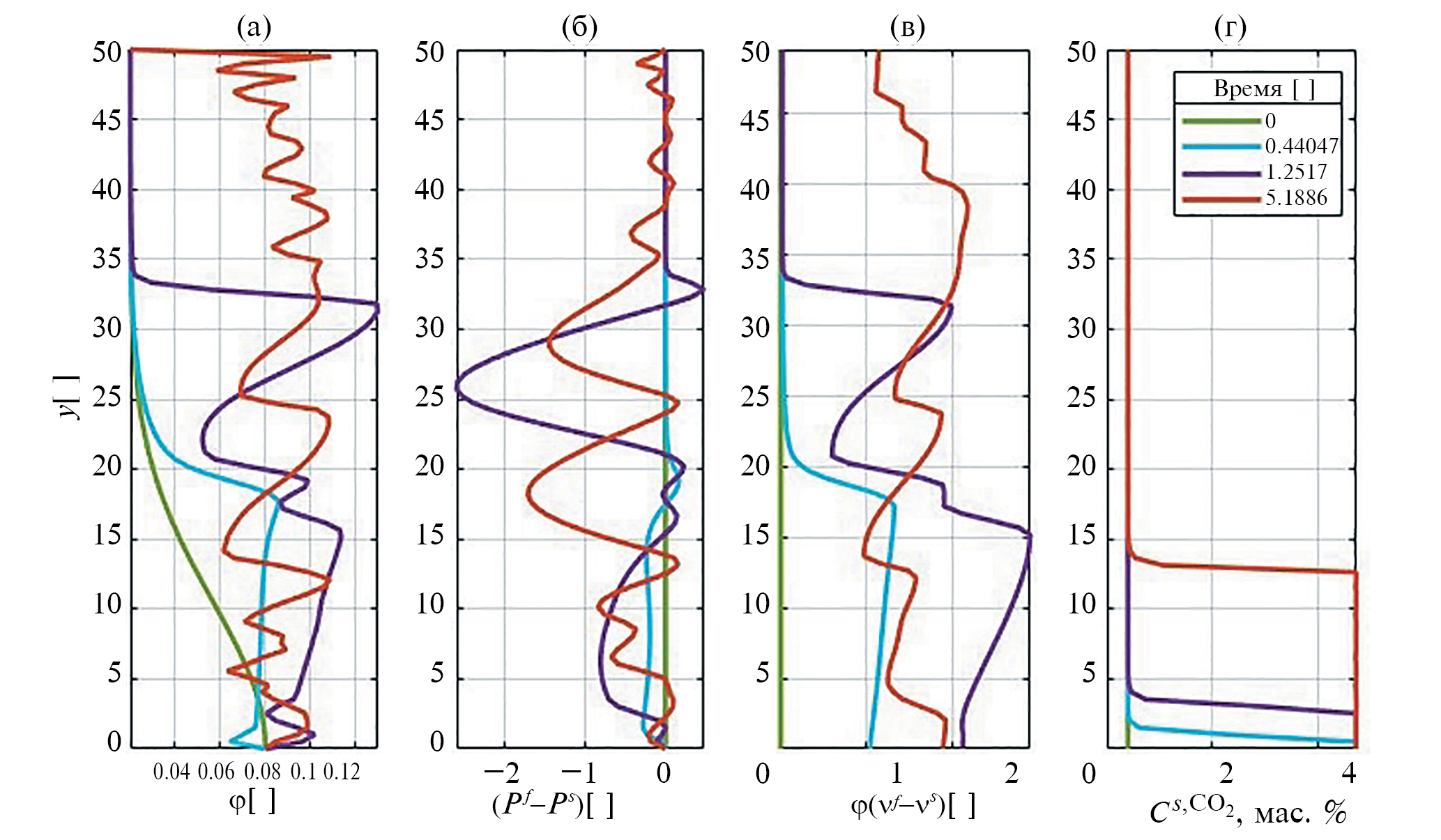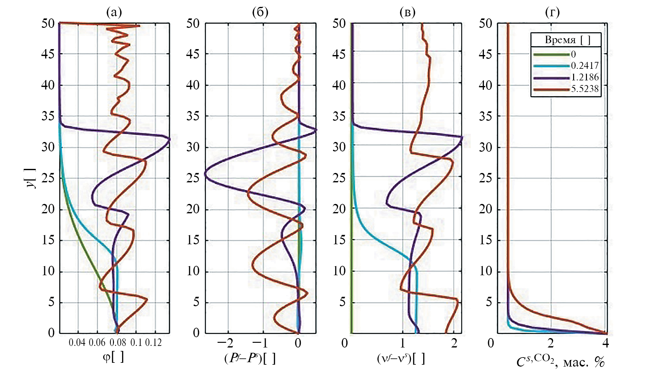 Рис. 6. Результаты расчетов гидро-хемо-механической численной модели при закачке флюида с повышенным содержанием растворенного CO₂ (Cf,CO₂ = 1.38 мас. %). (а) – пористость, (б) – эффективное давление, (в) – поток Дарси и (г) – массовая концентрация CO₂ в твердой матрице в разные моменты времени.