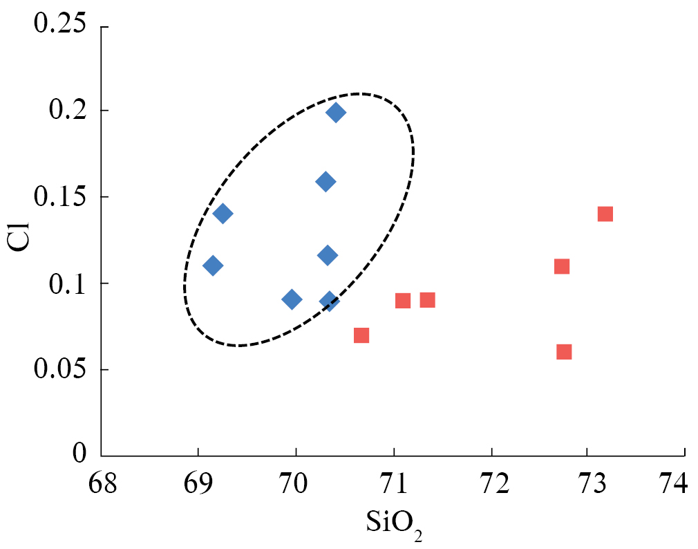 По мере уменьшения доли расплава до 5% содержание H₂O в нем увеличивалось до 11 мас. % – максимально возможного значения при соответствующих Р-Т параметрах. Тренд Б на рис. 7а можно объяснить продолжающимся ростом/перекристаллизацией кварца при подъеме магмы из глубинного очага (примерно 16–18 км) к близповерхностным условиям. Этот подъем сопровождался отделением от магмы СО2, рассолов и далее все более бедного солями водного флюида. Этот сценарий хорошо согласуется и с вариациями содержания Cl в расплавных включениях (рис. 8): в ходе глубинной кристаллизации Cl накапливается в расплаве вплоть до состояния насыщения (0.2 мас. %), а затем удаляется из расплава в виде рассола и/или все более разбавленного раствора.