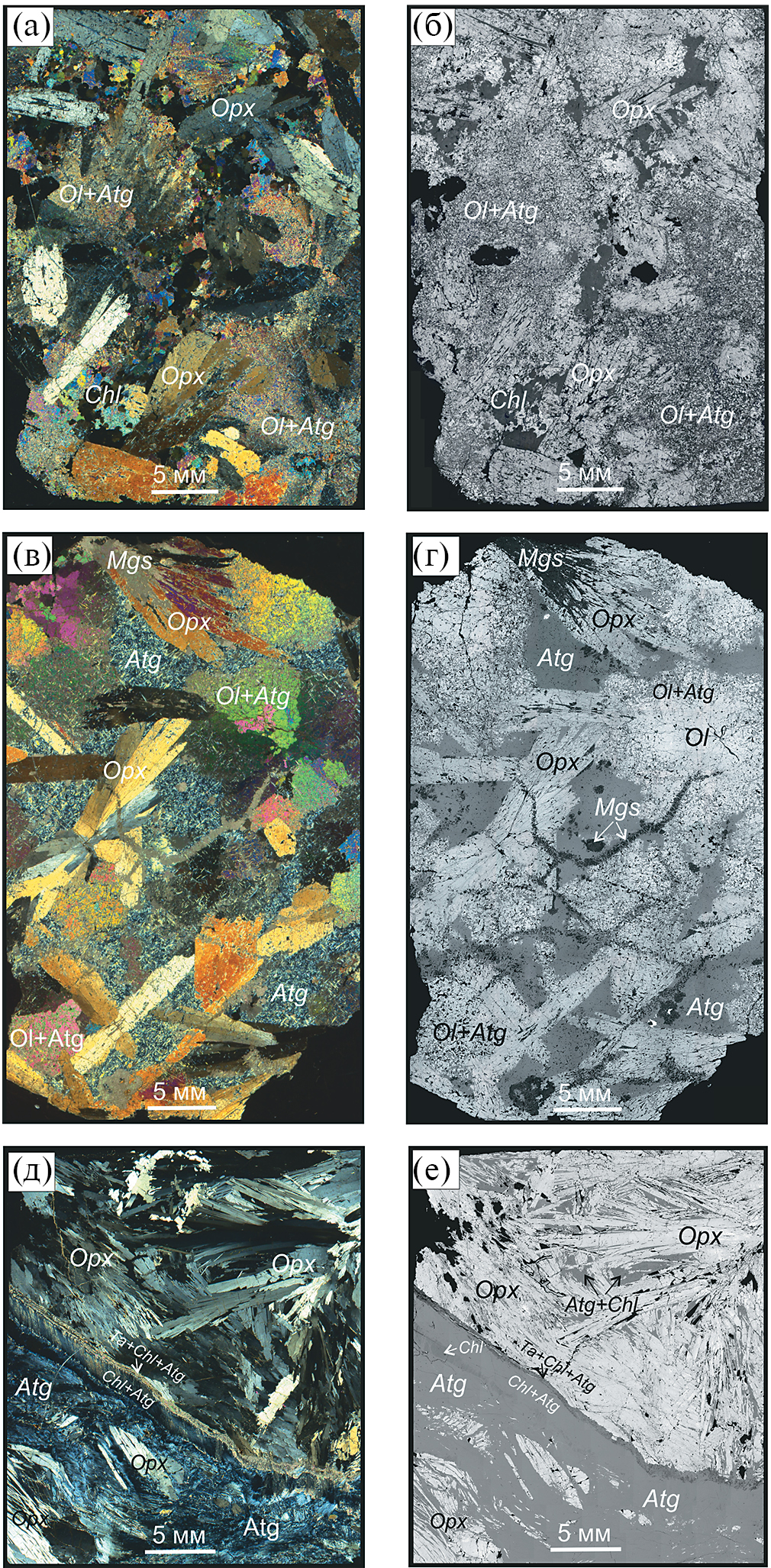 Рис. 4. Сканированные шлифы (со скрещенными поляризационными пленками) и их изображения в обратнорассеянных электронах (справа) исследованных пород. (а, б) – Atg-Chl метагарцбургит (обр. МК 3.23). (в, г) – Mgs-Atg метагарцбургит (обр. МК 3.25). (д, е) – Atg-Chl метаортопироксенит с антигоритовой жилой (обр. МК 3.22).