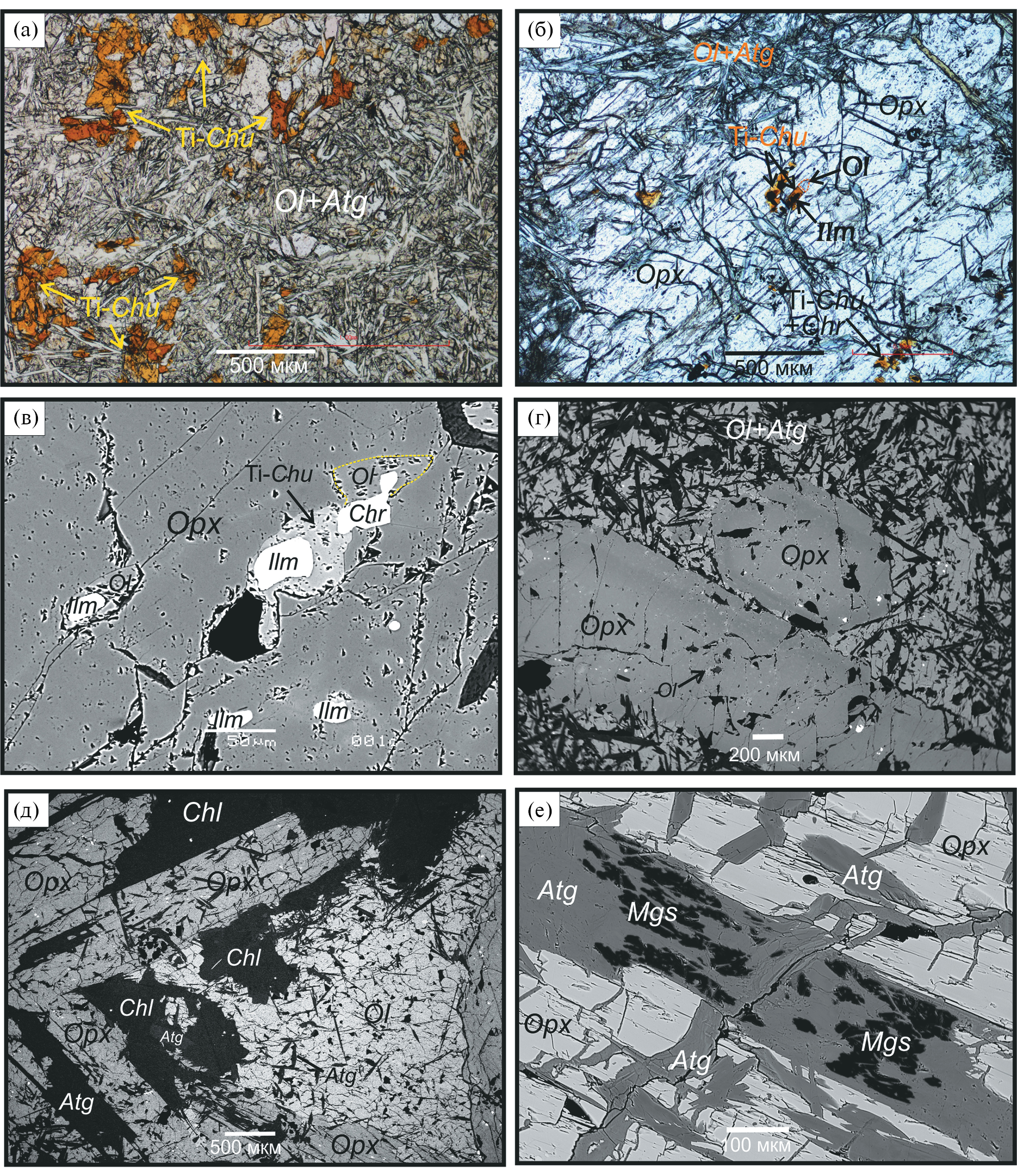 Ортопироксен обычно имеет идиоморфные очертания на границах с хлоритом и антигоритом (рис. 5б). Примечательно, что в оливине, контактирующем с хлоритом, наблюдается пониженное количество игл антигорита по сравнению с оливином в бесхлоритовой области (сравните рис. 5г и 5д). Магнезит часто ассоциирует с антигоритом (рис. 5е). Иголочки антигорита иногда пронзают хлорит. Ti-клиногумит находится во включениях в оливине и в ортопироксене (рис. 5а–5в). Его можно встретить в срастаниях с хромитом или в полиминеральном включении Ti-Chu + + Ol + Ilm ± Chr (рис. 5б, 5в). Хромит образует сыпь из мельчайших (<50 мкм) включений в оливине и ортопироксене.