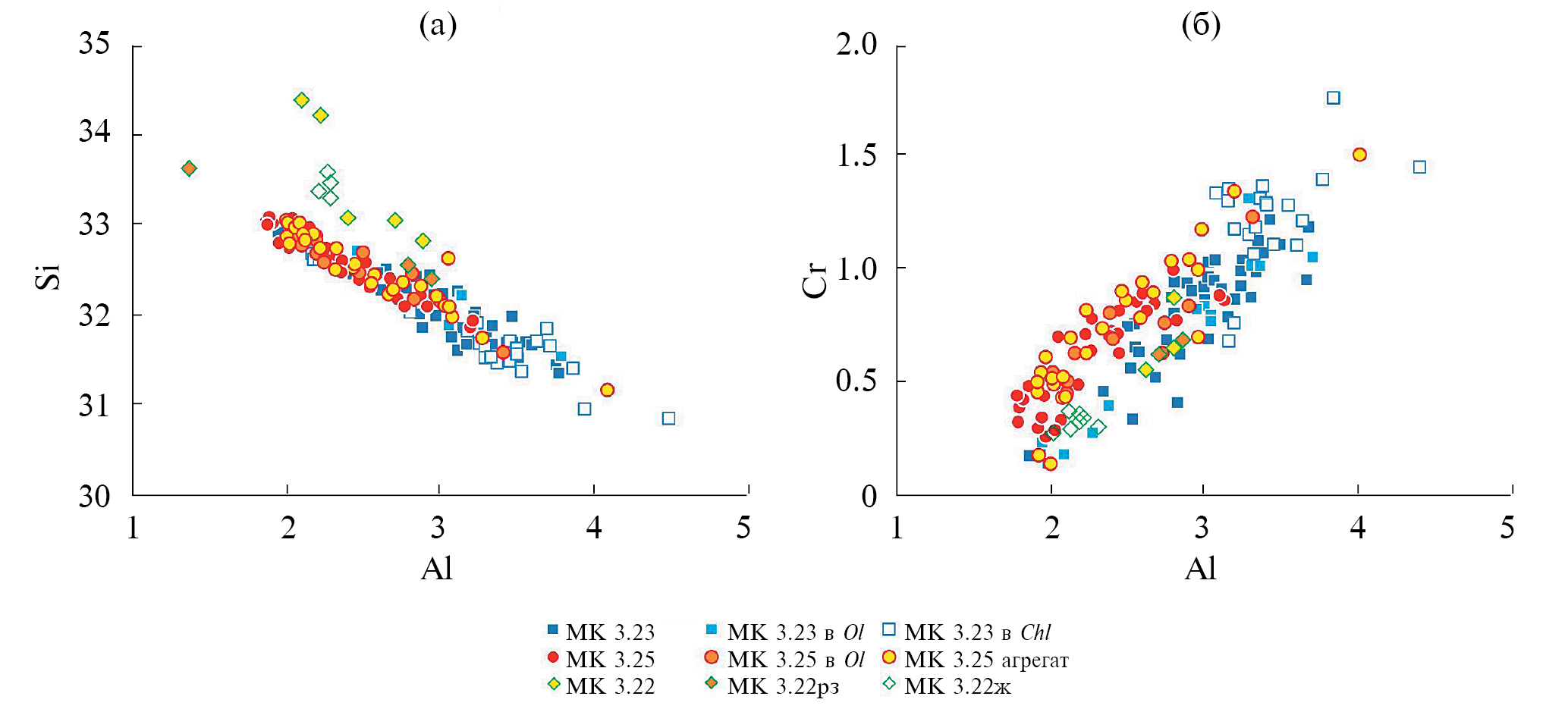 Насколько нам известно, это наиболее хромистые антигориты из высокобарных метаморфических комплексов (Padrón-Navarta et al., 2011; Shen et al., 2015 и ссылки в них). Между содержаниями алюминия и кремния в антигорите видна четкая отрицательная корреляция (рис. 9а), между хромом и алюминием – положительная (рис. 9б). В метагарцбургитах антигорит образует плотные массы между ортопироксенами и оливинами. Состав антигорита здесь меняется в широком диапазоне (рис. 9), даже на микроуровне. Игольчатые включения в оливине и в ортопироксене имеют сходные вариации состава, иголочки в хлорите из Chl метагарцбургита отличаются повышенными содержаниями Cr и Al. Закономерностей в изменении состава в пределах каждого структурного типа (включения, плотные массы) не выявлено. Антигорит в Atg-Chl метаортопироксените находится в нижней части поля составов антигорита из Atg-Chl метагарцбургита (рис. 9). В серпентинитовой жиле из этого образца содержание Cr снижается до 0.3 форм. ед.