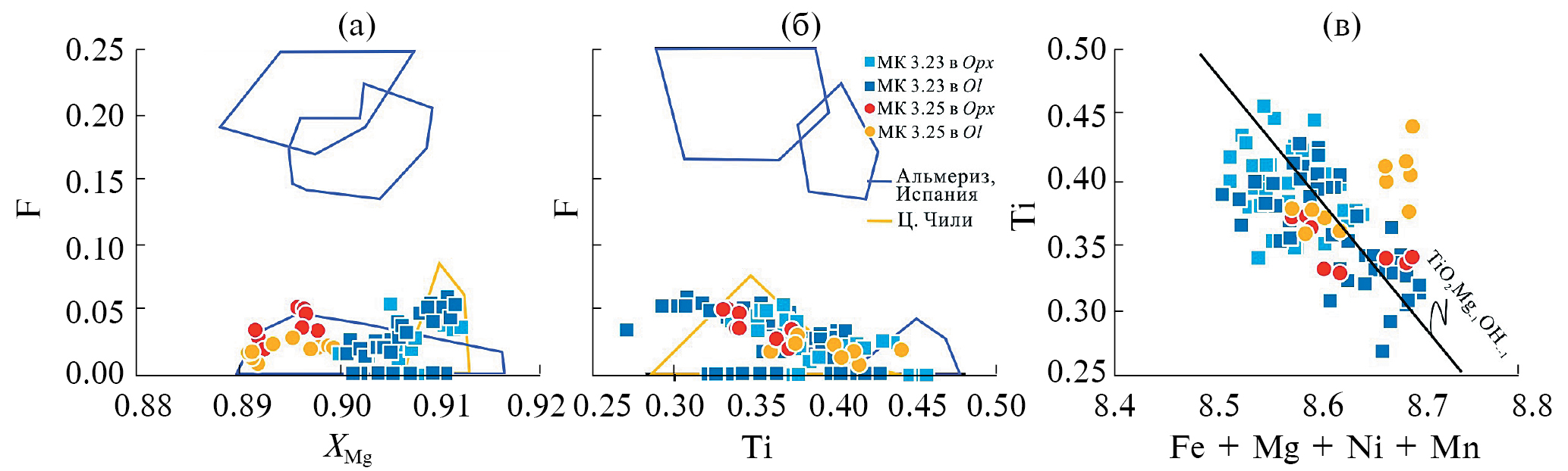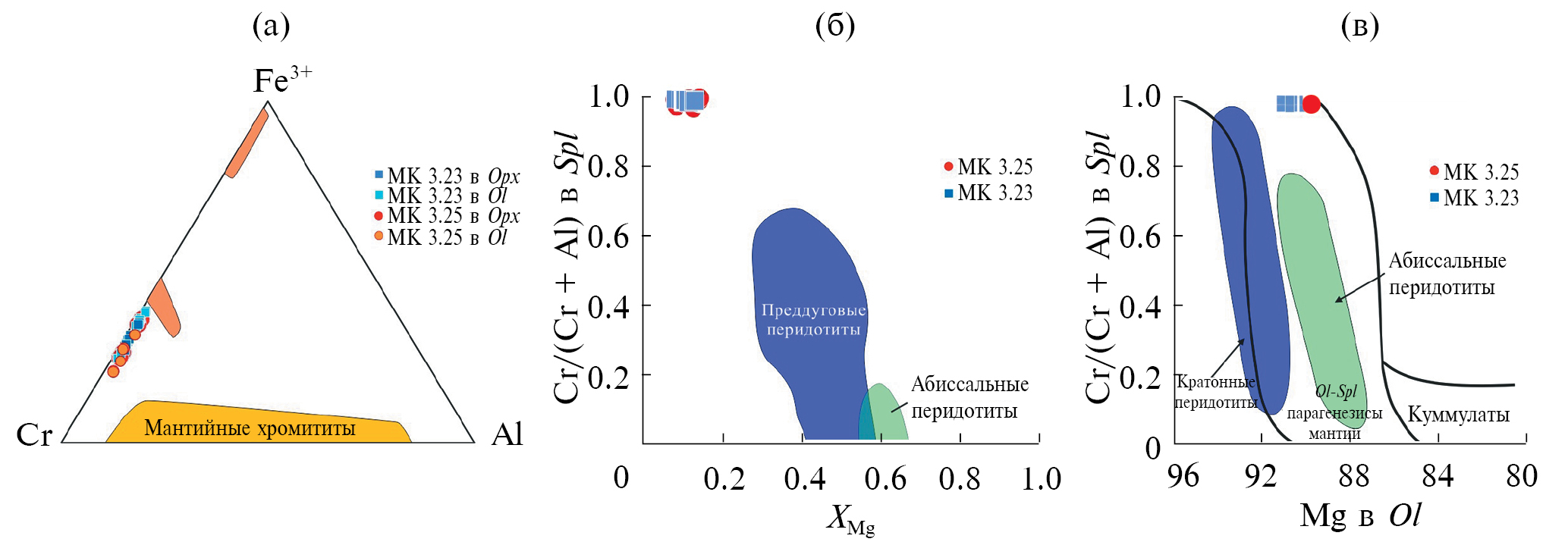 Оливин образует реликтовые зерна в матриксе породы и находится во включениях в ортопироксене в двух образцах метагарцбургитов (MK 3.23 и MK 3.25). Оливины в обоих образцах имеют составы, отличающиеся на сотую долю по магнезиальности (табл. 2, рис. 7). Зональность в пределах отдельных зерен не выявлена. Включения оливина в ортопироксене в каждой из пород, как правило, попадают в диапазоны составов оливинов матрикса. При этом все оливины заметно отличаются от оливинов из мантийных перидотитов и базальтов СОХ (MORB) повышенным содержанием никеля, частично попадая в большое поле оливинов из океанических островов, OIB (рис. 7а). Повышенное содержание никеля характерно для метаморфогенных оливинов из высокобарных комплексов (Endo et al., 2015).