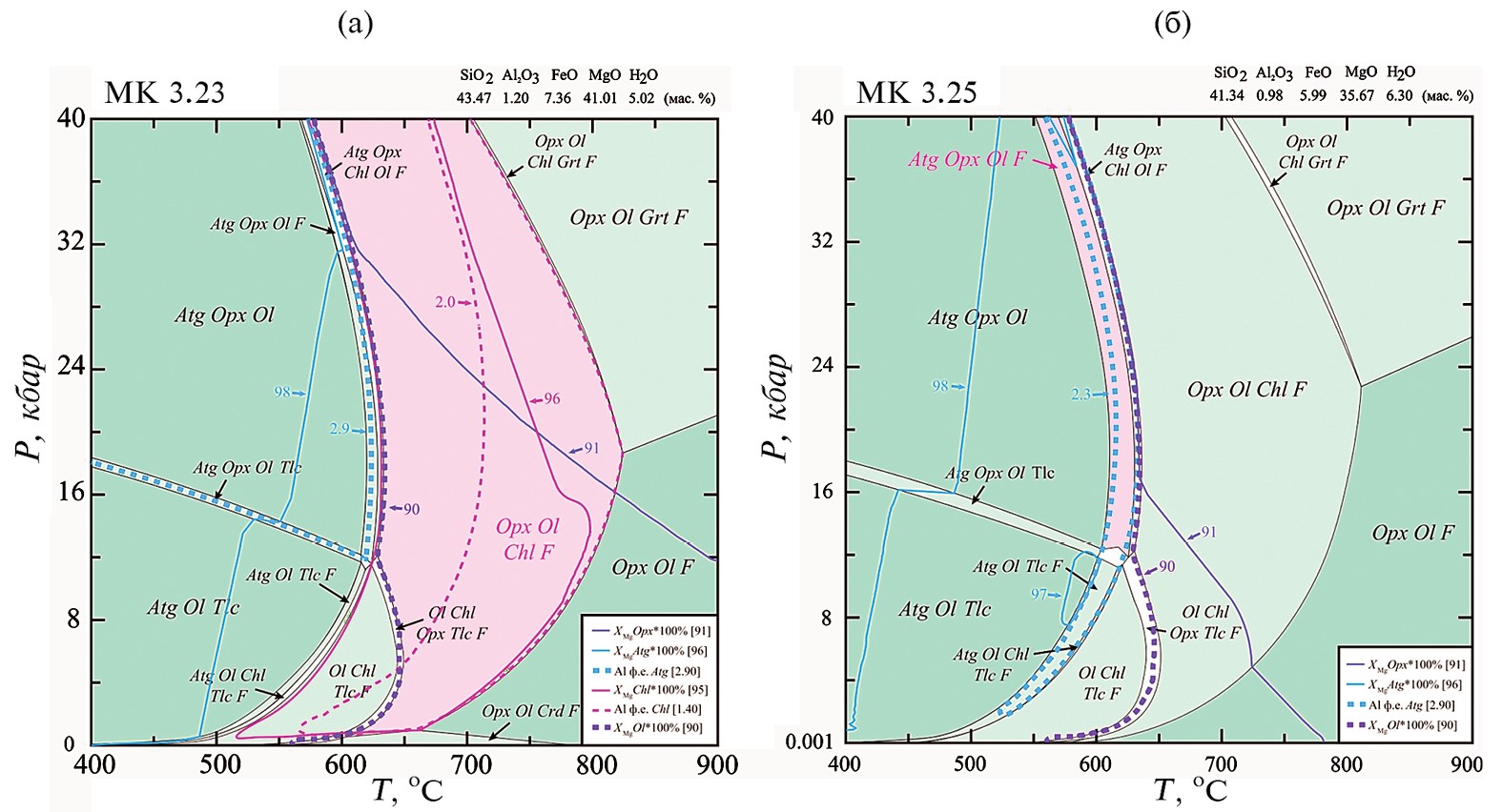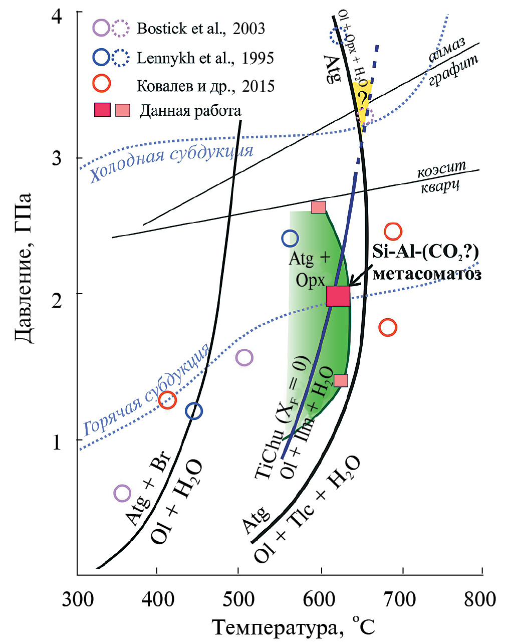 Р-Т диаграмма с полем стабильности антигорита (рис. 1а) предсказывает широкую распространенность высокобарных серпентинитов в надсубдукционной мантии независимо от ее термальной структуры. Несмотря на это, серпентиниты (метаперидотиты) в высокобарных метаморфических комплексах субдукционного генезиса не всегда содержат запись о Р-Т условиях глаукофансланцевой или эклогитовой фаций метаморфизма (например, Вализер и др., 2013б).