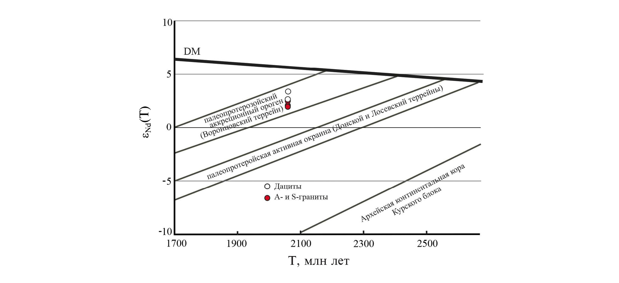 Изотопный состав Nd был измерен в двух валовых образцах дацита: 548-с/185.7, для которого было выполнено изотопное датирование циркона, и 548-с/237.6. Величина εNd(2069) составляет 2.6 и 3.4, а модельный возраст TNd(DM) – 2258 и 2222 млн лет (табл. 3, рис. 8) соответственно, что свидетельствует о короткой коровой предыстории ювенильных мантийных источников расплавов.