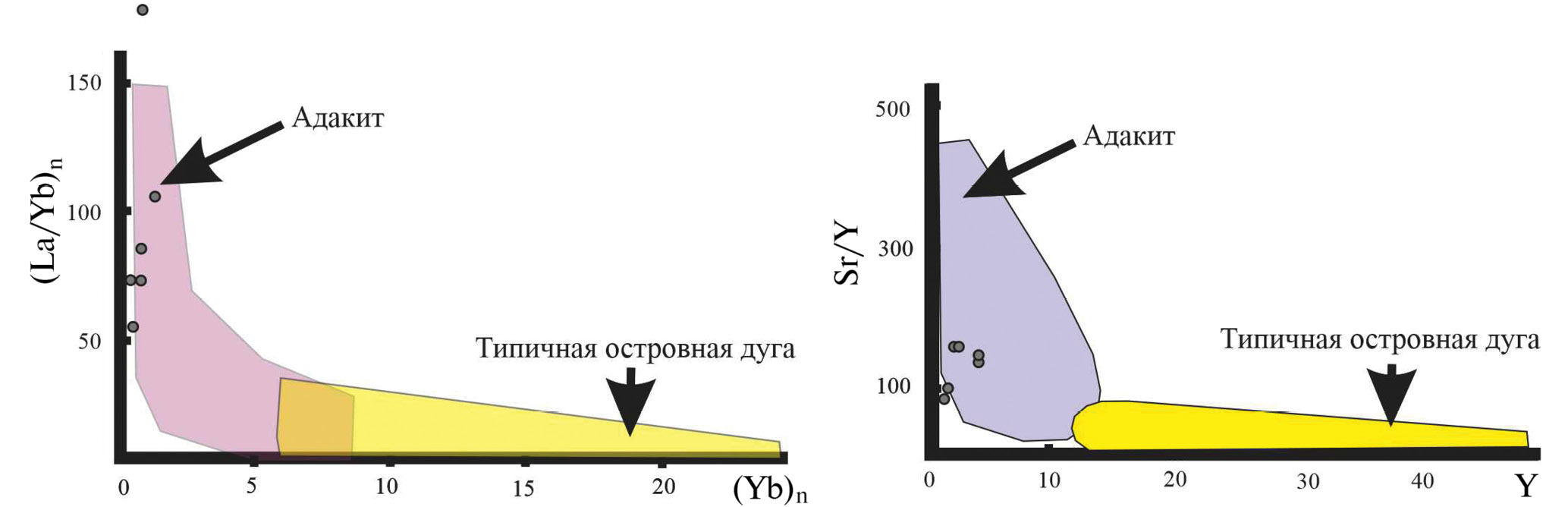 По геохимическим признакам дациты Воронцовского террейна близки к высокобарическим трондьемитам архейских ТТГ-ассоциаций (Moyen, 2011) (рис. 10), но отличаются от них большей деплетированностью литофильных и высокозарядных элементов, более высокой железистостью и аномальным фракционированием легких и тяжелых REE. От типичных адакитов дациты отличают низкие содержания совместимых элементов Ni, Cr и Mg. В последней сводке по геохимии (Sotiriou et al., 2023) архейские ТТГ-ассоциации со значением (Gd/Yb)n > 10 являются единичным случаем. Также крайне редко они отмечались в протерозойских и фанерозойских трондьемитах и адакитах.