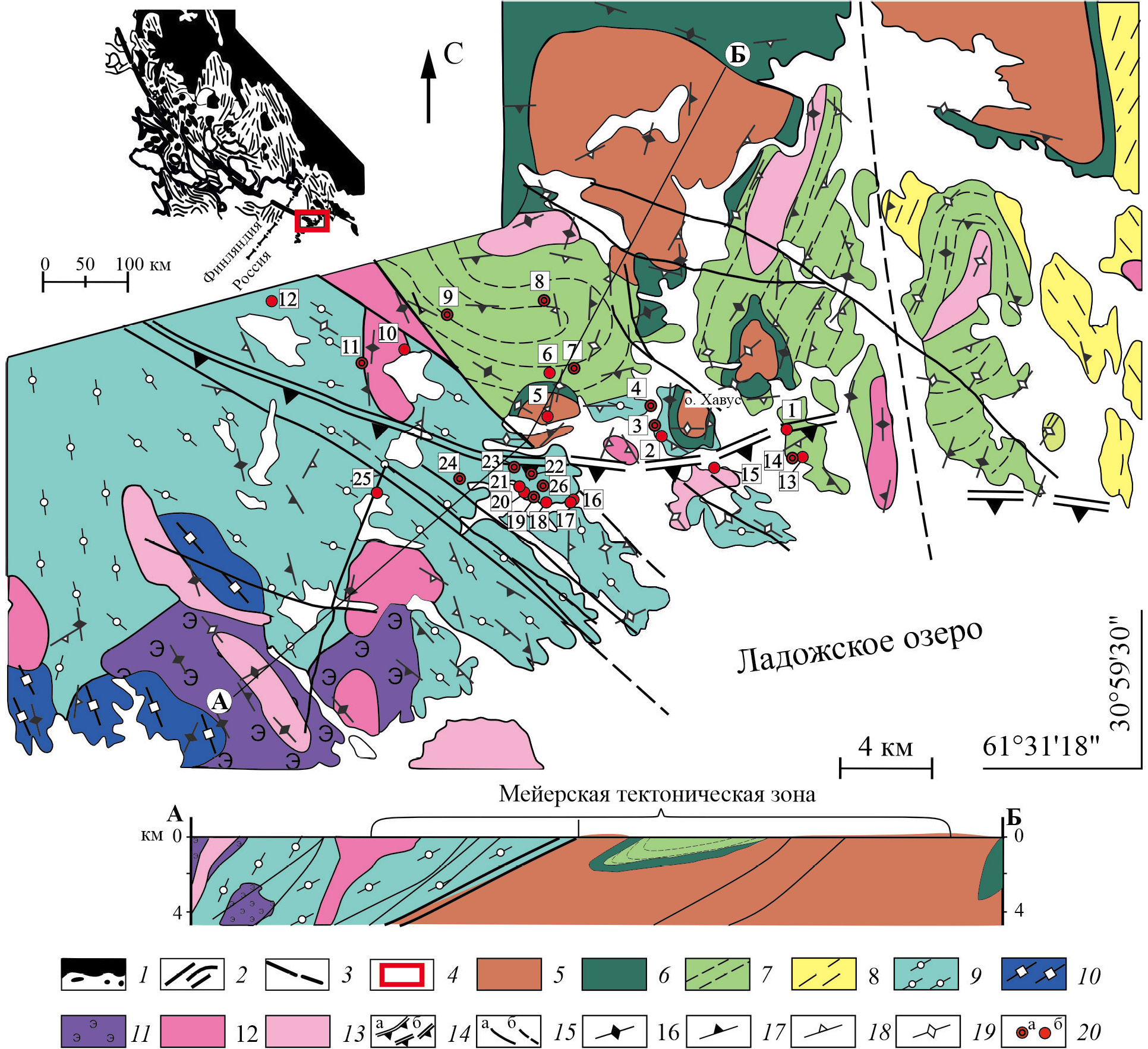 Рис. 1. Схема геологического строения района Мейерской тектонической зоны. 1–4 (на врезке): 1 – архейский фундамент в пределах Карельского кратона и его фрагменты; 2 – палеопротерозойские сланцы и гнейсы; 3 – главная сутура Раахе-Ладожской зоны; 4 – изученная площадь Мейерской тектонической зоны. 5 – архейские гранито-гнейсы; 6–10 – палеопротерозойские амфиболиты, сланцы и гнейсы сортавальской, ладожской и лахденпохской серий: 6 – ранний протерозой, метабазиты (амфиболиты) сортавальской серии, 7, 8 – ладожская серия: 7 – мусковитовые, ставролитовые сланцы, 8 – мусковит-биотитовые, гранатовые гнейсы, 9, 10 – лахденпохская серия: 9 – гранат-кордиеритовые, гранат-биотитовые гнейсы и мигматиты, 10 – гиперстеновые гнейсы; 11–13 – свекофеннские интрузии: 11 – синорогенный куркиекский комплекс 1.89–1.88 млрд лет (нориты, эндербиты), 12 – синорогенный лауватсарско-импиниемский комплекс 1.88–1.87 млрд лет (ранняя фаза: габбро, диориты, кварцевые диориты; поздняя фаза: тоналиты), 13 – позднеорогенные калиевые граниты нерасчлененные 1.87–1.80 млрд лет; 14 – положение главного сместителя тектонической зоны: а – установленное, б – предполагаемое; 15 – разломы: а – установленные, б – предполагаемые; 16–19 ‒ ориентировка сланцеватости и гнейсовидности: 16 – субвертикальной (70°–90°), 17 – крутопадающей (50°–70°), 18 – пологопадающей (30°–50°), 19 – субгоризонтальной (0°–30°); 20 – местоположение обнажений, образцы из которых: а – использованы при Р-Т-метрии, б – прочие; цифрами обозначены номера образцов: 1–12 – автохтонного блока (1 – 5442a, 2 – 5267a, 3 – Б-20-455-2, 4 – Б-20-454, 5 – 996-1, 6 – 994-1, 7 – Б-20-425, 8 – Б-20-458, 9 – Б-20-464, 10 – Б-20-461, 11 – Б-20-417, 12 – 4098б), 13–26 – аллохтонного блока (13 – 5445, 14 – 5444a, 15 – 5785, 16 – Б-20-436, 17 – Б-20-435, 18 – Б-20-433, 19 – Б-20-427, Б-20-427-1, 20 – Б-20-466, 21 – Б-20-441, 22 – 2465v, 23 – Б-20-439, 24 – Б-20-450, 25 – Б-20-448, 26 – 5206в). Разрез по линии А–Б.