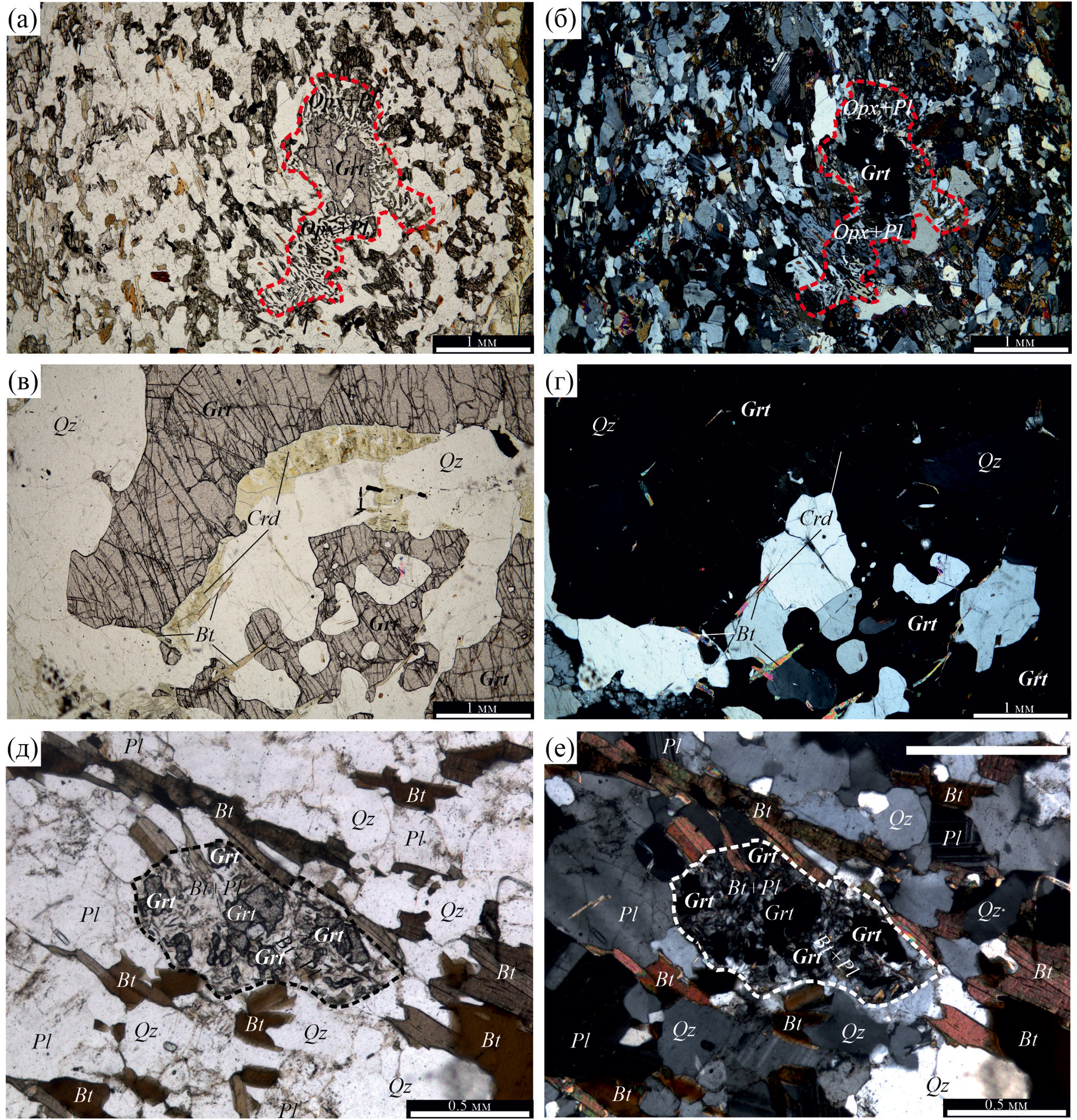 Рис. 2. Микрофотографии шлифов метаморфических пород МТЗ, сохранивших следы протекания минеральных реакций пиковой и регрессивной стадий минералообразования: (а, б) – обр. 5444а, в котором наблюдаются гиперстен-плагиоклазовые симплектиты, образованные вокруг порфиробласта граната; (в, г) – обр. 5206в с кордиеритовой каймой вокруг граната; (д, е) – обр. Б-20-417 с интенсивным замещением граната плагиоклаз-биотитовым агрегатом.