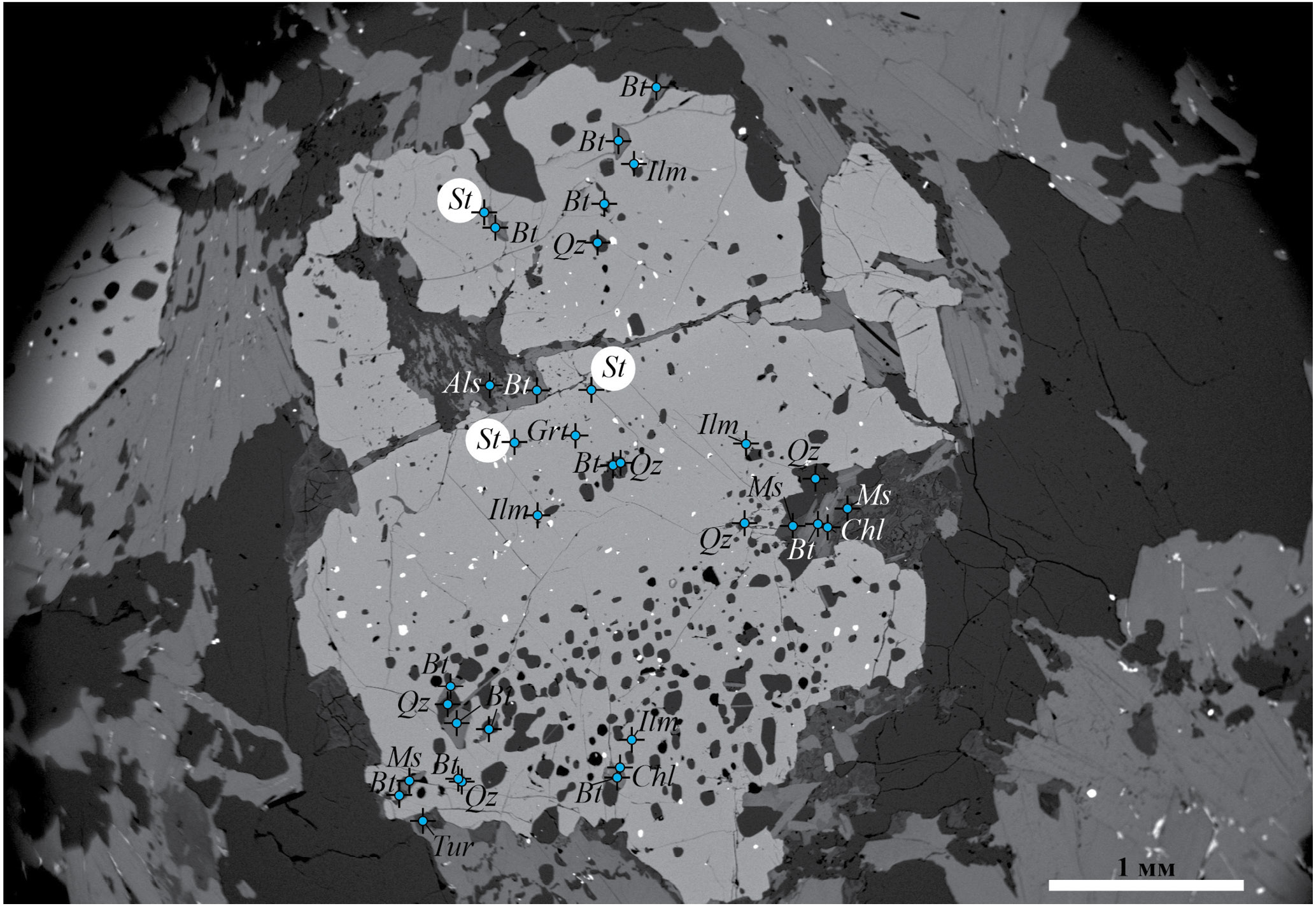 Рис. 3. BSE-изображение порфиробласта граната из обр. Б-20-458 (автохтонный блок МТЗ) с большим количеством минеральных включений, в том числе зерен ставролита.