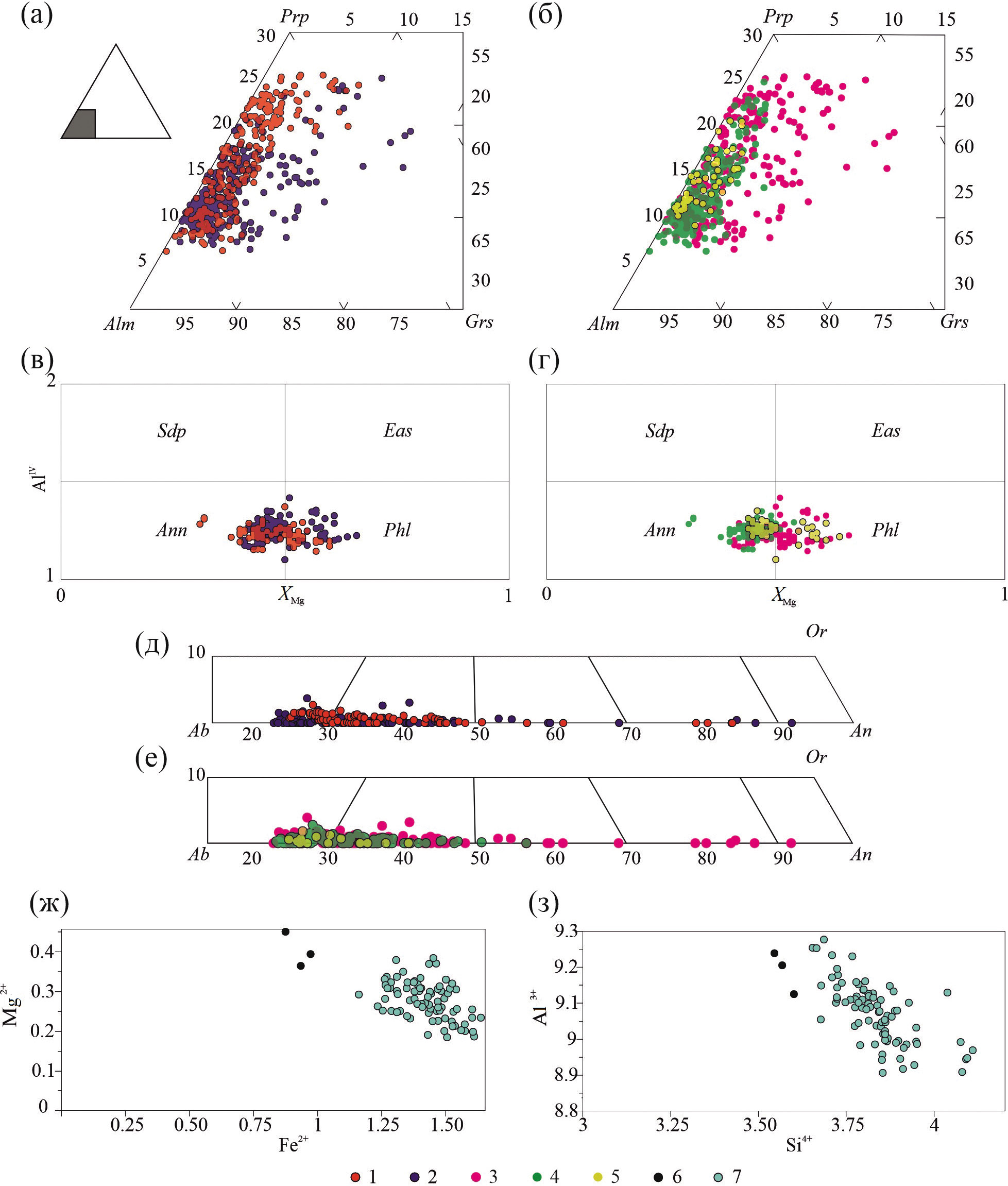 Рис. 4. Диаграммы особенностей химического состава граната (а, б), биотита (в, г), плагиоклаза (д, е) и ставролита (ж, з) из изученных пород Мейерской тектонической зоны. Точками разного цвета показан состав минералов пород (1) аллохтонного и (2) автохтонного блоков МТЗ для групп пород (3–5): 3 – гранат-биотитовой, 4 – гранат-мусковит-биотитовой, 5 – высокоглиноземистой. Для сравнения состава ставролита из обр. Б-20-458 автохтонного блока МТЗ (6) на диаграммах (ж, з) представлен состав этого минерала из ставролитовых сланцев ладожской серии (7), распространенных к северу от МТЗ.