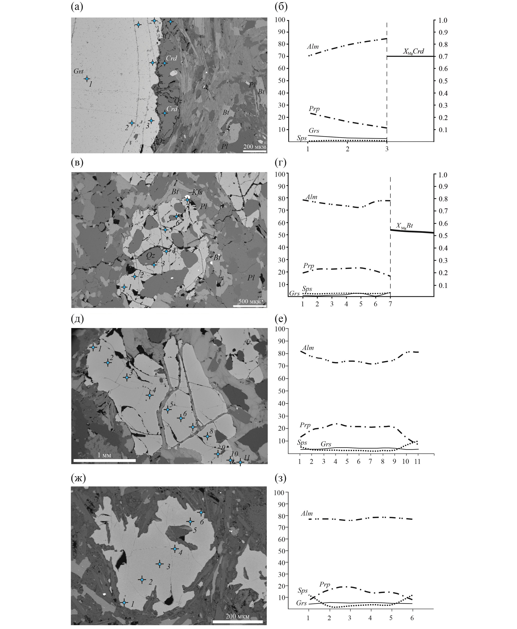 Рис. 5. BSE-изображения порфиробластов граната из образцов, соответственно, 5206в (а), Б-20-427 (в), Б-20-448 (д) и Б-20-439 (ж), а также профили (б, г, е, з) изменения содержания альмандина (Alm), пиропа (Prp), спессартина (Sps) и гроссуляра (Grs) через точки, номера и местоположение которых указаны на зернах; жирными линиями показано изменение магнезиальности (XMg) кордиерита (б) и биотита (г) на контакте с гранатом.