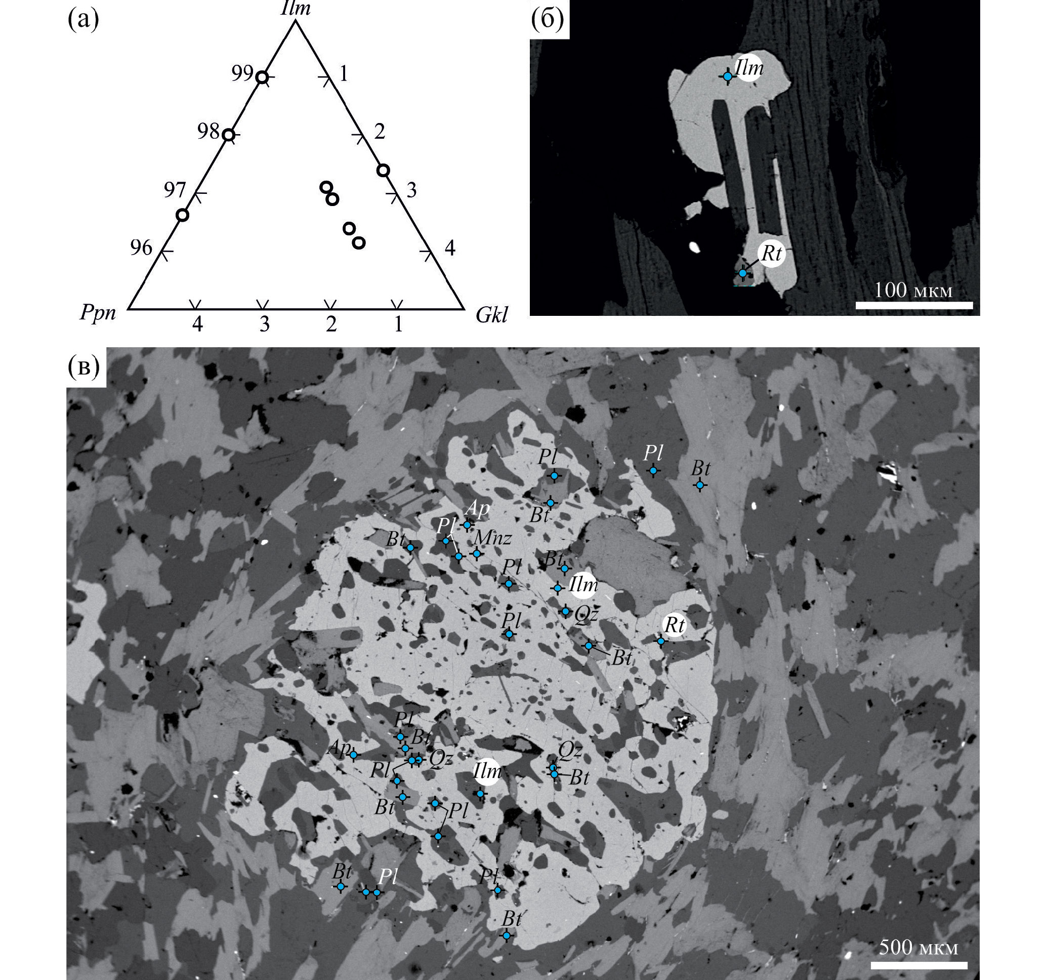 В некоторых образцах метаморфических пород МТЗ присутствуют ильменит и рутил. Они встречены как в матриксе пород, так и в виде включений в гранате, биотите, реже в кварце и плагиоклазе. В большинстве пород одновременное присутствие рутила и ильменита не было выявлено. Однако в обр. Б-20-455–2 и Б-20-425 гранат-мусковит-биотитовых гнейсов и высокоглиноземистого гнейса, обр. Б-20-464, обнаружены оба эти минерала (рис. 7б, 7в). Ассоциация гранат-рутил-ильменит указывает на равновесие: