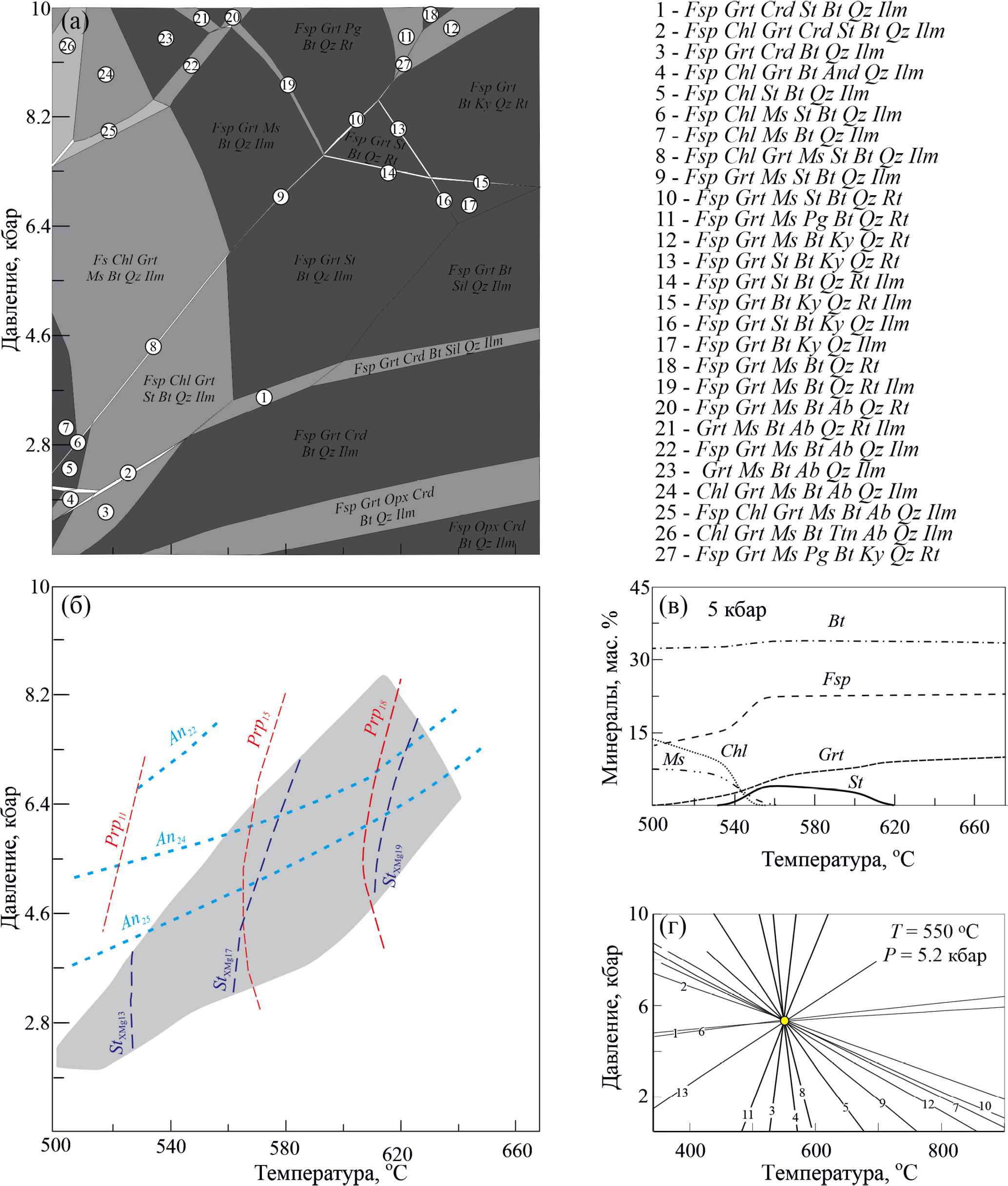 Совместно с данными мультиравновесной термобарометрии (рис. 8г), моделирование указывает на то, что ставролит образовался в температурном интервале 500–600°С и давлении около 5 кбар. Он сосуществовал с ильменитом (рис. 8а), а не с рутилом, что подтверждается петрографическими наблюдениями (рис. 3).