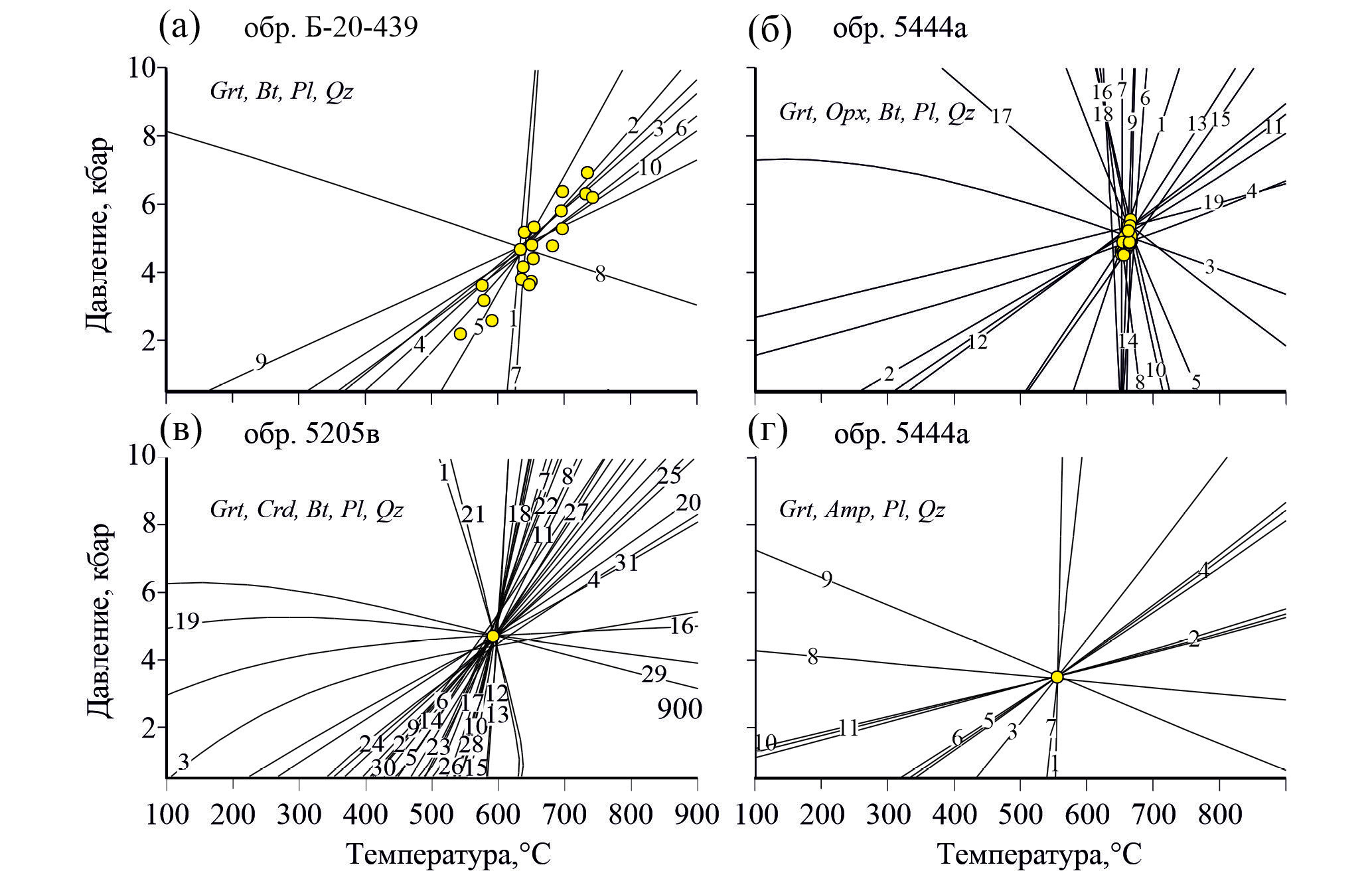 Рис. 9. Р–Т диаграммы для пород МТЗ с минеральными парагенезисами пиковой и регрессивной стадий минералообразования. Показаны рассчитанные в программе winTWQ пересечения линий минеральных реакций для парагенезисов: (а) – гранат + биотит + плагиоклаз + кварц (обр. Б-20-439); (б) – ортопироксен + гранат + плагиоклаз + + кварц (обр. 5444а); (в) – кордиерит + гранат + биотит + плагиоклаз + кварц (обр. 5206в); (г) – амфибол + гранат + плагиоклаз + кварц (обр. 5444а). Для амфиболсодержащего парагенезиса расчеты проведены с использованием базы данных JUN92 (Berman, 1988). Список реакций и их номера приведены в Supplementary, ESM_10.xlsx.