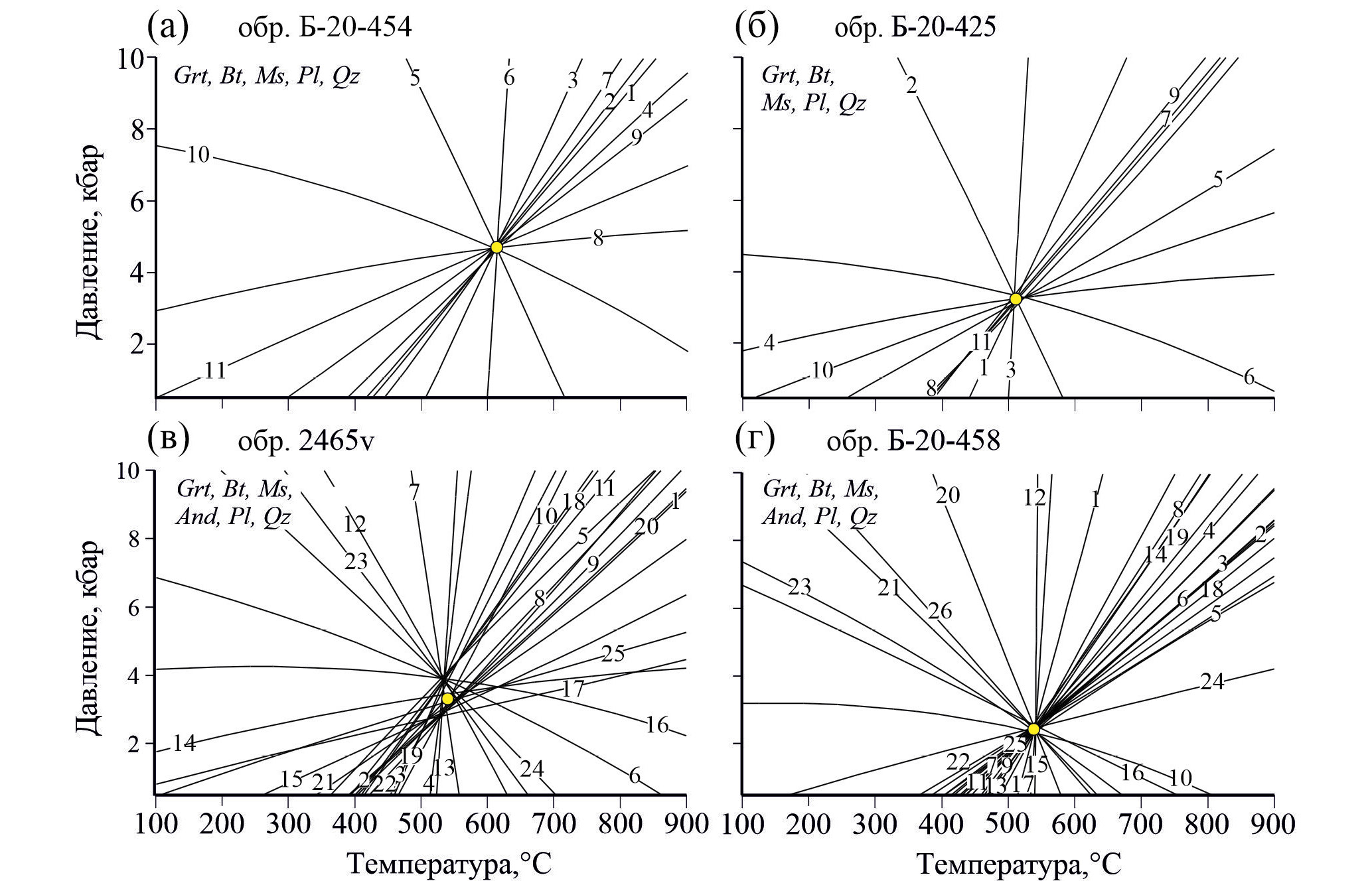 Рис. 10. Р–Т диаграммы для мусковитсодержащих ассоциаций пород МТЗ. Показаны линии минеральных реакций, полученные методом мультиравновесной термобарометрии в winTWQ, для парагенезисов: гранат + биотит + мусковит + кварц (обр. Б-20-454 (а) и Б-20-425 (б)); гранат + биотит + андалузит + мусковит + кварц (обр. 2465v (в) и обр. Б-20-458 (г)). Список реакций и их номера приведены в Supplementary, ESM_11.xlsx.