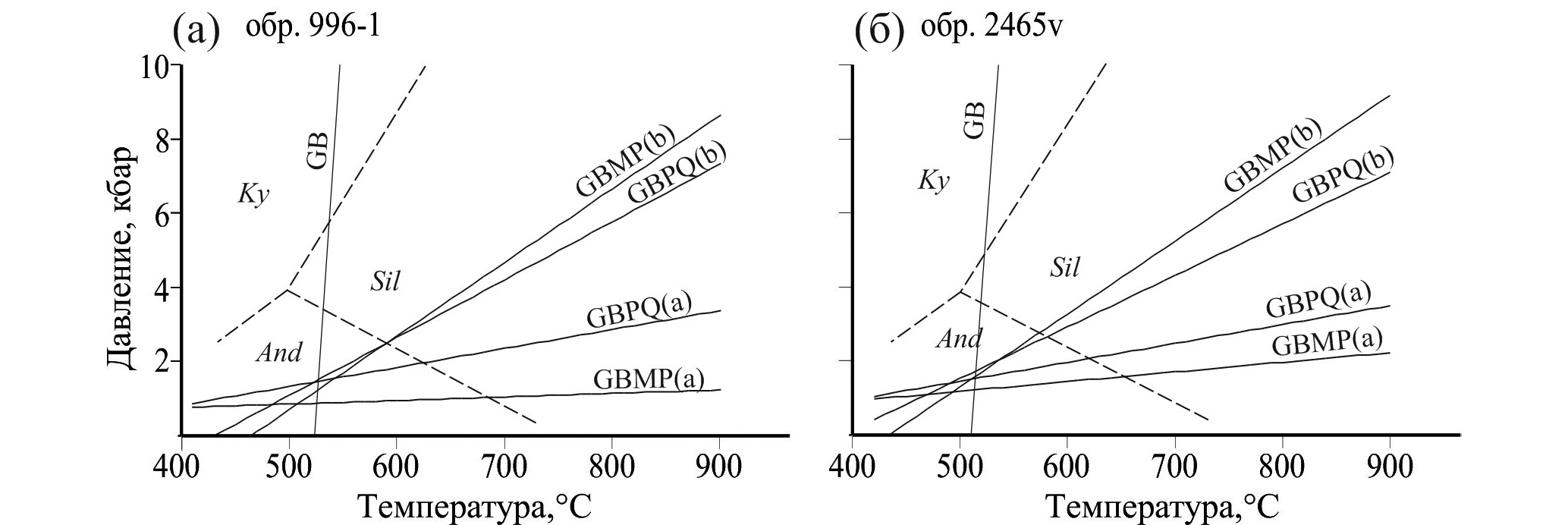 Рис. 11. Р–Т диаграммы для образцов гранат-мусковит-биотитовых гнейсов МТЗ: (а) – обр. 996-1, (б) – обр. 2465v. Линии минеральных реакций рассчитаны методом «классической» термобарометрии с применением гранат-биотитового геотермометра (GB, Holdaway, 2000), гранат-биотит-плагиоклаз-кварцевого геобарометра (GBPQ, Wu et al., 2006) и гранат-биотит-мусковит-плагиоклазового геобарометра (GBMP, Wu, 2015).