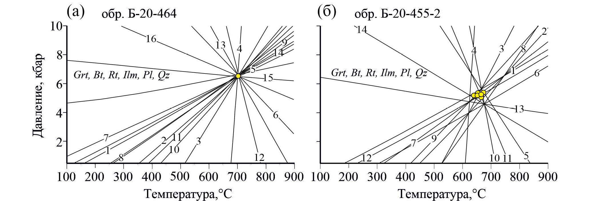 Рис. 12. Р–Т диаграммы, построенные методом мультиравновесной термобарометрии, для парагенезисов гранат + + биотит + ильменит + рутил + плагиоклаз + кварц из образцов гнейсов МТЗ: (а) – Б-20-464, (б) – Б-20-455-2. Список реакций и их номера приведены в Supplementary, ESM_12.xlsx.
