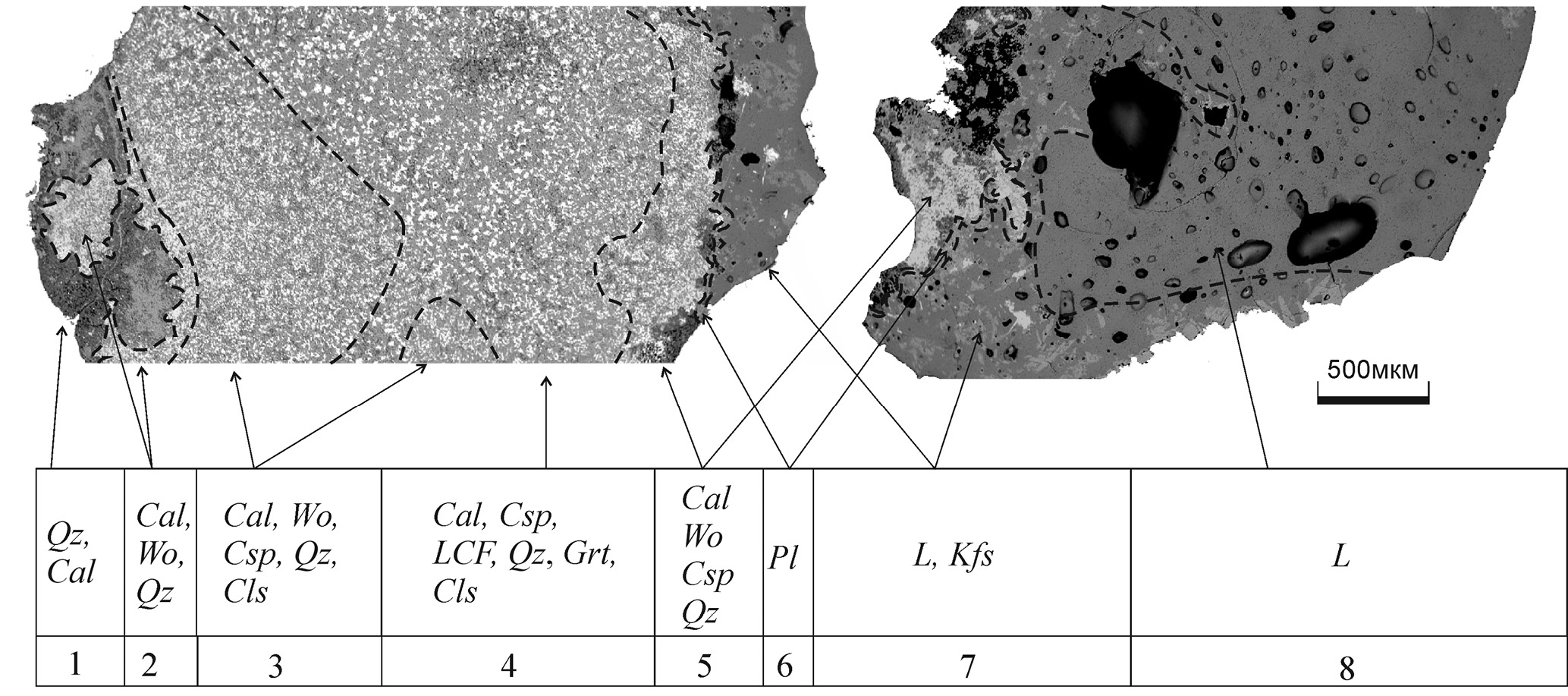 В разных зонах апокарбонатной части образуются волластонит, куспидин, кварц, гранат, цельзиан и ранее неизвестная кальций-кремне-карбонатно-фторидная фаза, которая при параметрах эксперимента, по всей видимости, была жидкостью.