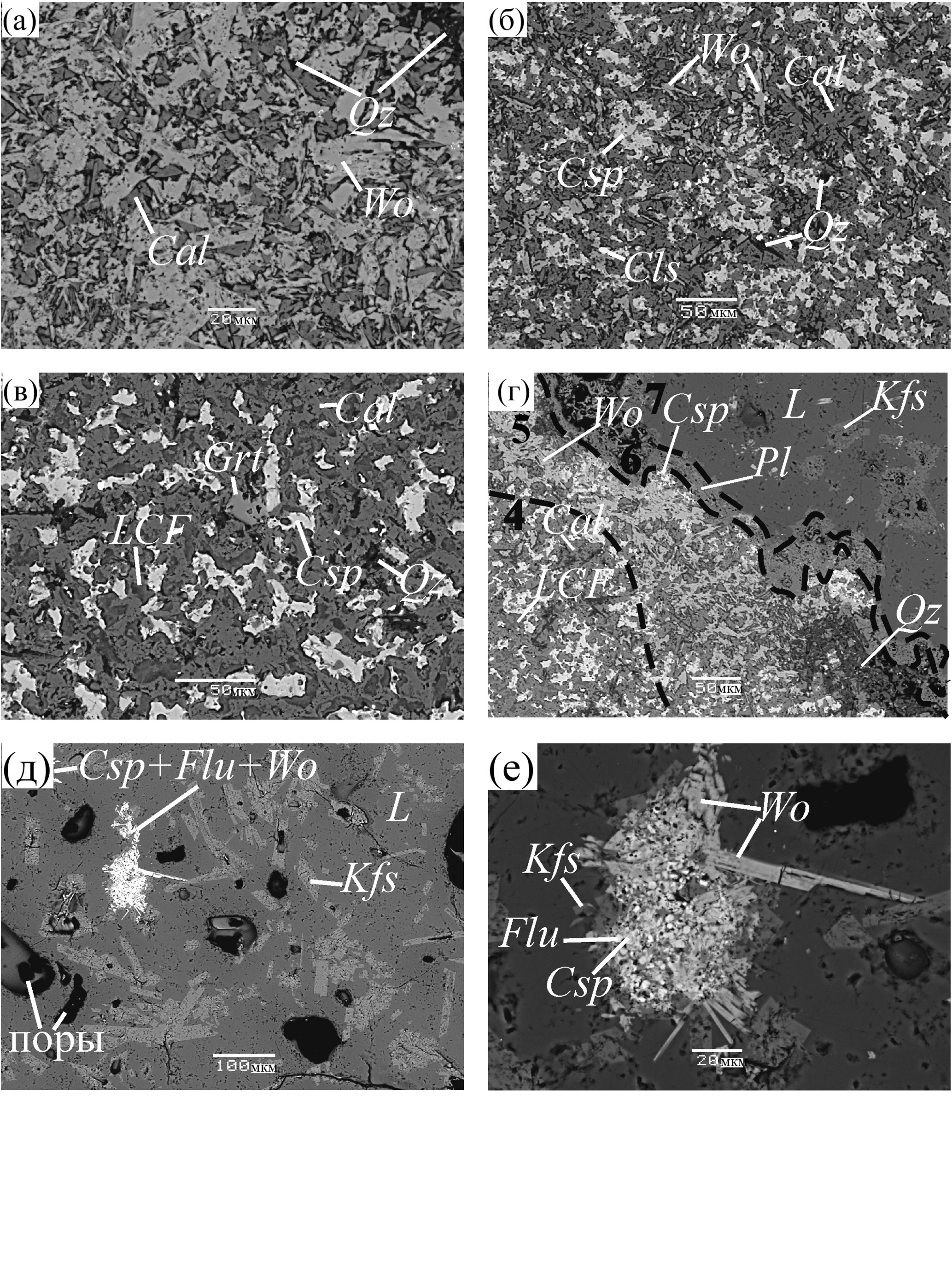 Рис. 3. Минеральный состав и структура: (а) зона 2; (б) зона 3; (в) зона 4; (г) приконтактовая область (зоны 4, 5, 6, 7); (д) зона 7; (е) флюорит-куспидин-волластонитовый агрегат в зоне 7. Граница между зонами 4 и 5 определенна по появлению волластонита и исчезновению фазы LСF. Зона 6 состоит из плагиоклаза. Зона 7 – из алюмосиликатного стекла и щелочного полевого шпата.