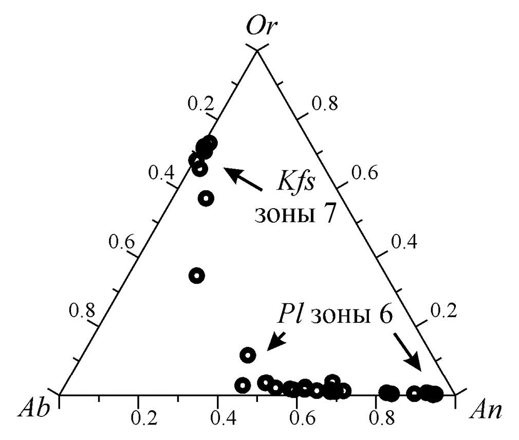 Рис. 4. Составы полевых шпатов из зон 6 и 7.
