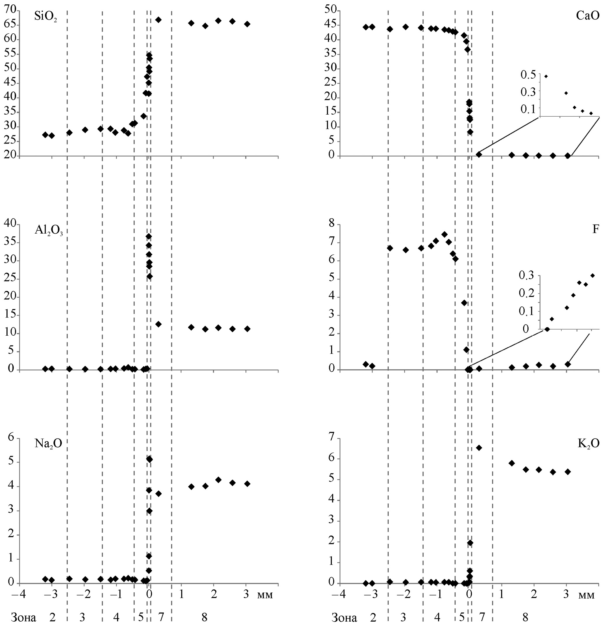 Границы зон колонки взаимодействия, проведенные по минеральным признакам, хорошо согласуются с изменением количества фтора по образцу. В зоне 2, имеющей кварц-кальцит-волластонитовый состав, содержание F близко к нулю. С появлением куспидина концентрация F возрастает до 7 мас. % и сохраняется постоянной на всем протяжении зоны 3. Дальнейший рост количества F проявлен в исчезновении волластонита и появлении высокофтористой фазы переменного состава LСF. Зона 5 характеризуется резко неоднородным распределением фтора. Самое низкое валовое содержание F в апокарбонатной части неожиданно приходится на приконтактовую часть зоны 5. В приконтактовой области силикатной части концентрация F также близка к нулю и лишь немного (на 0.3 мас. %) увеличивается в зоне 8.